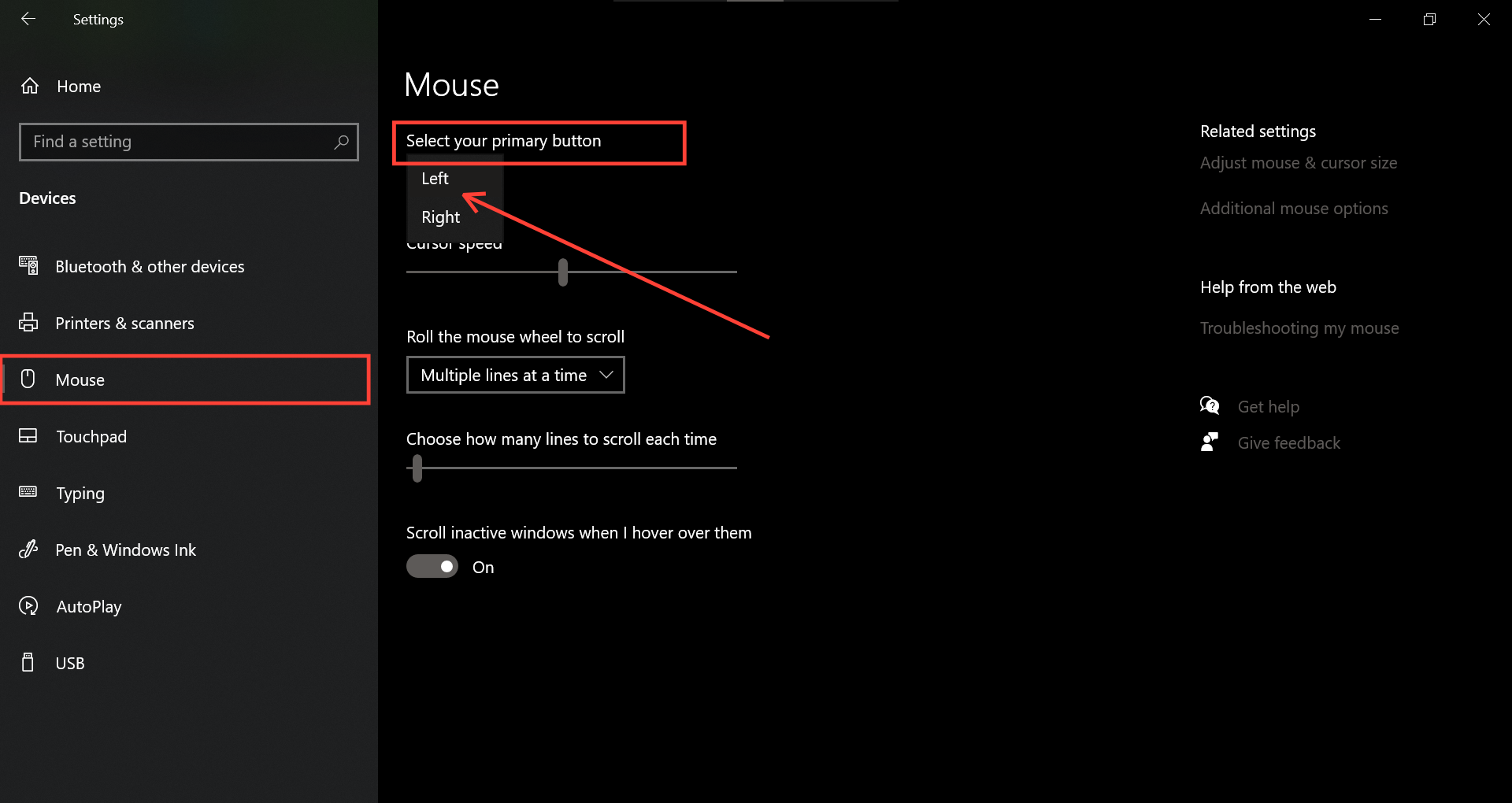 Step 4: In the Mouse window, use the drop-down menu under Select your primary button to select either Left or Right.