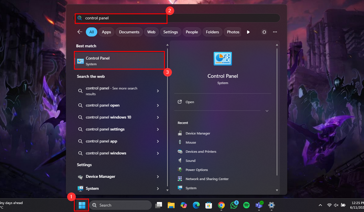 Step 1: Click the Start button, search for "Control Panel", and select the Control Panel app from the results