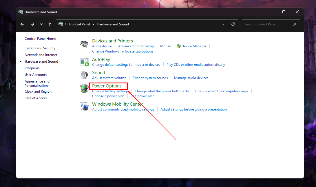 Step 2: In the Control Panel, select "Hardware and Sound"
