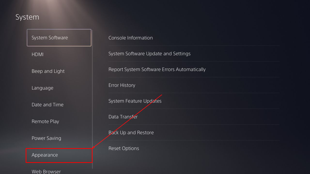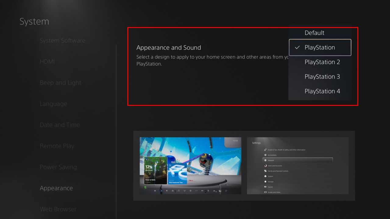 Step 4: Now, click "Appearance and Sound," then select your preferred theme from the available options. Each theme includes more than just visual flair; it also brings back each console's distinctive startup sound and subtle UI tweaks to match the era