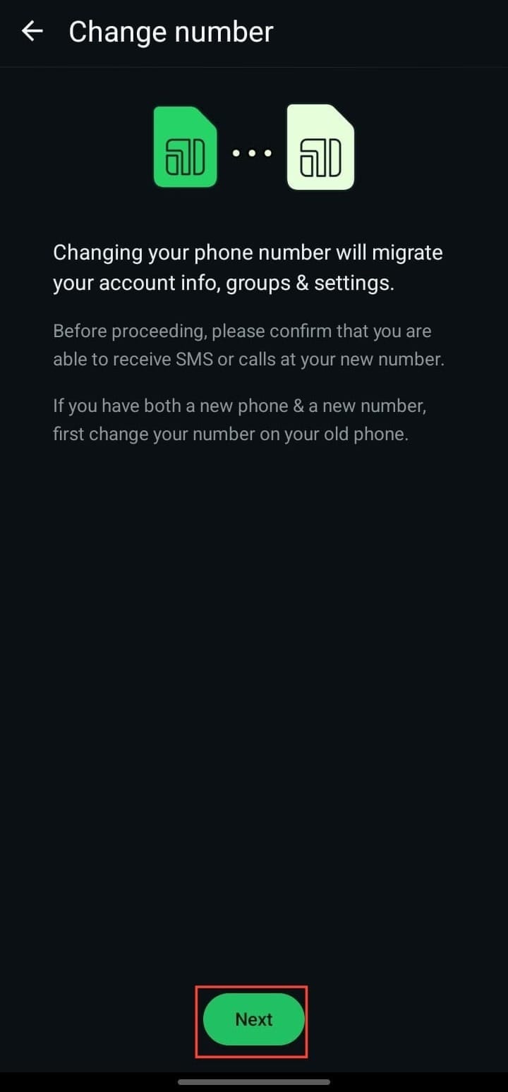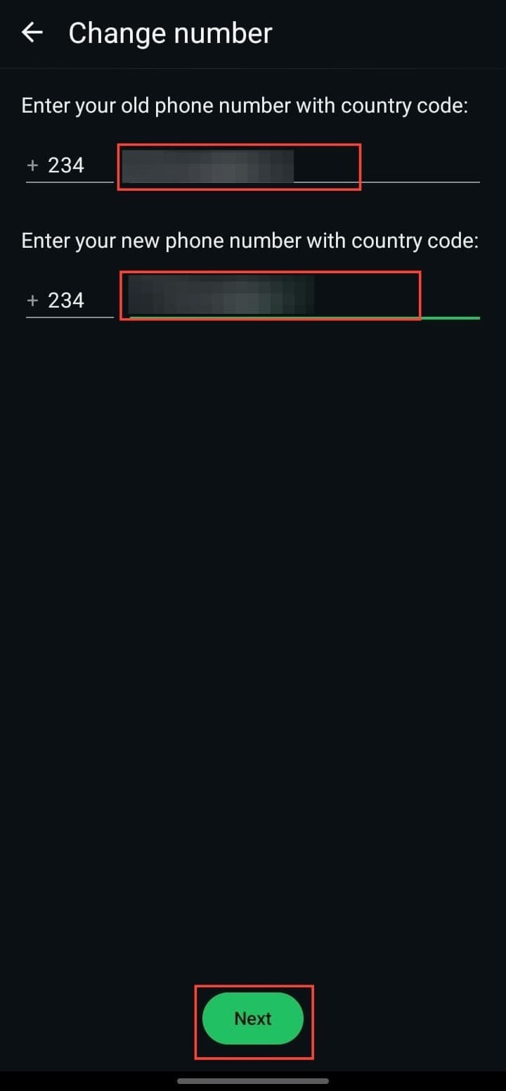 Step 5. On the Change Number page, you’ll see a prompt to enter your old and new numbers. Your old number is usually detected automatically; if not, type it in manually. Then, enter your new number in international format (country code included) and tap "Next."
