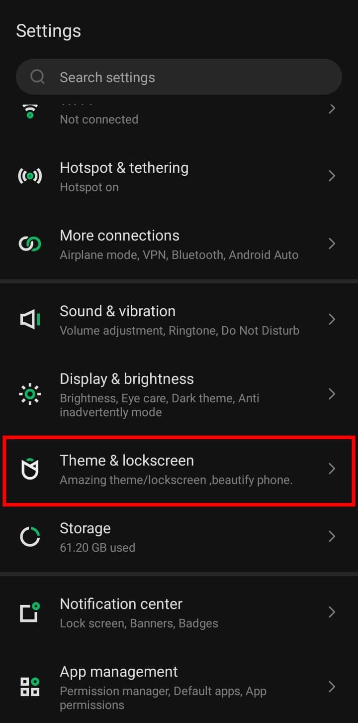 Step 1: Open your device's settings, scroll and select "Theme & lock screen". Or any section labelled "Themes"
