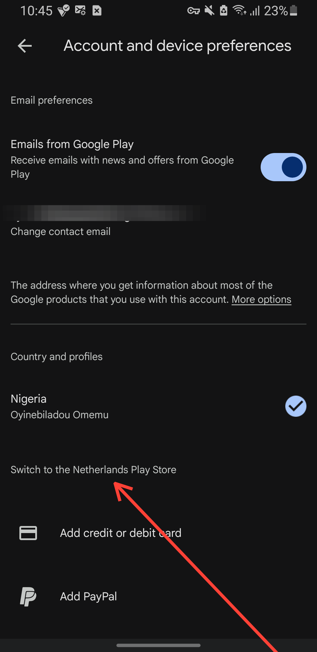 Step 6: Select Add credit or debit card (or the region-specific option) under the Switch to the [region] Play Store header to add a payment method for your new country. I'll go with PayPal.