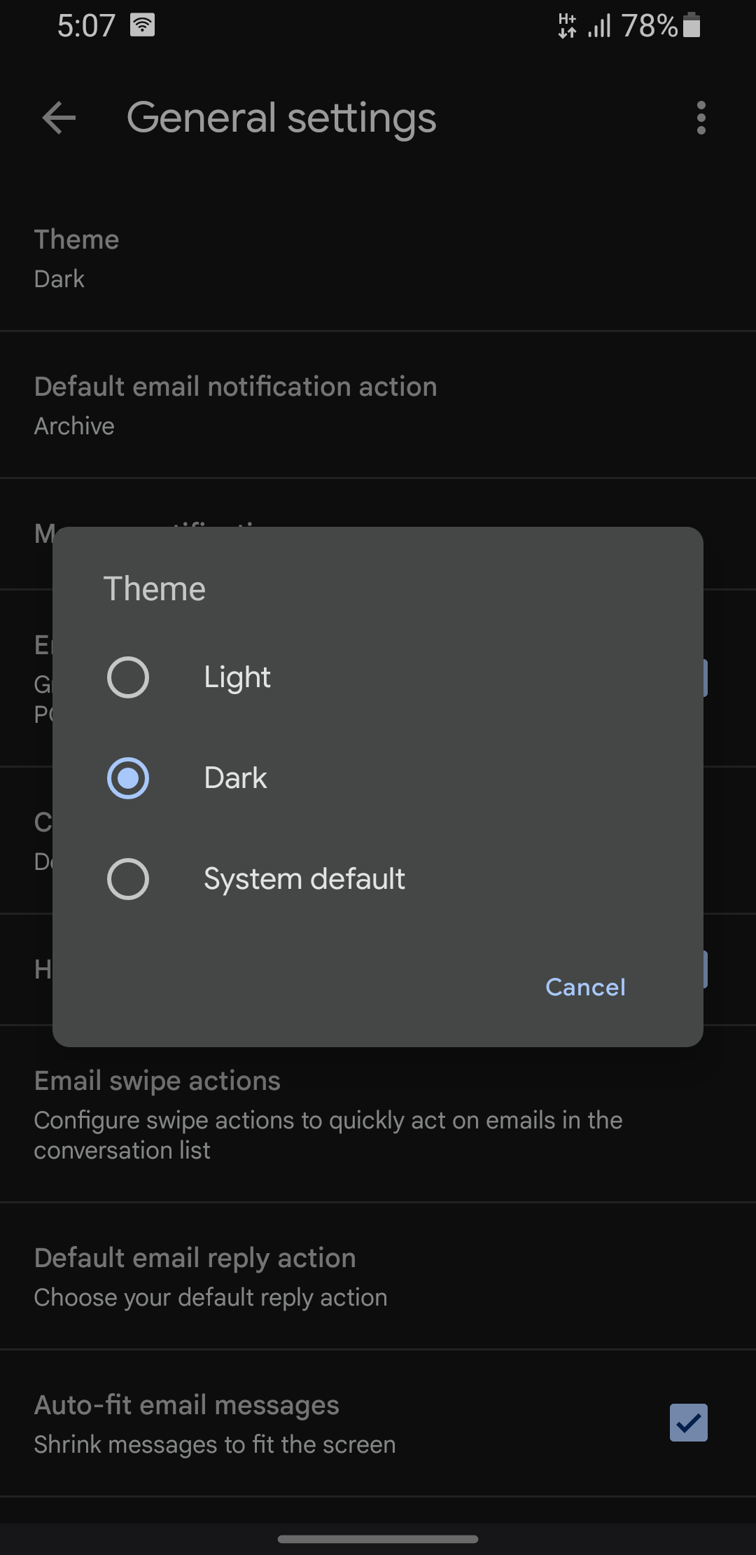 However, unlike on your computer where you get a lot of background themes, Android and iPhone native Gmail applications do not offer that much. Android at best offers the cliche dark, light, and default themes. Unfortunately, iPhones do not have the option to change the Gmail background within the native app. However, you can still achieve a similar effect by adjusting the phone's theme settings.