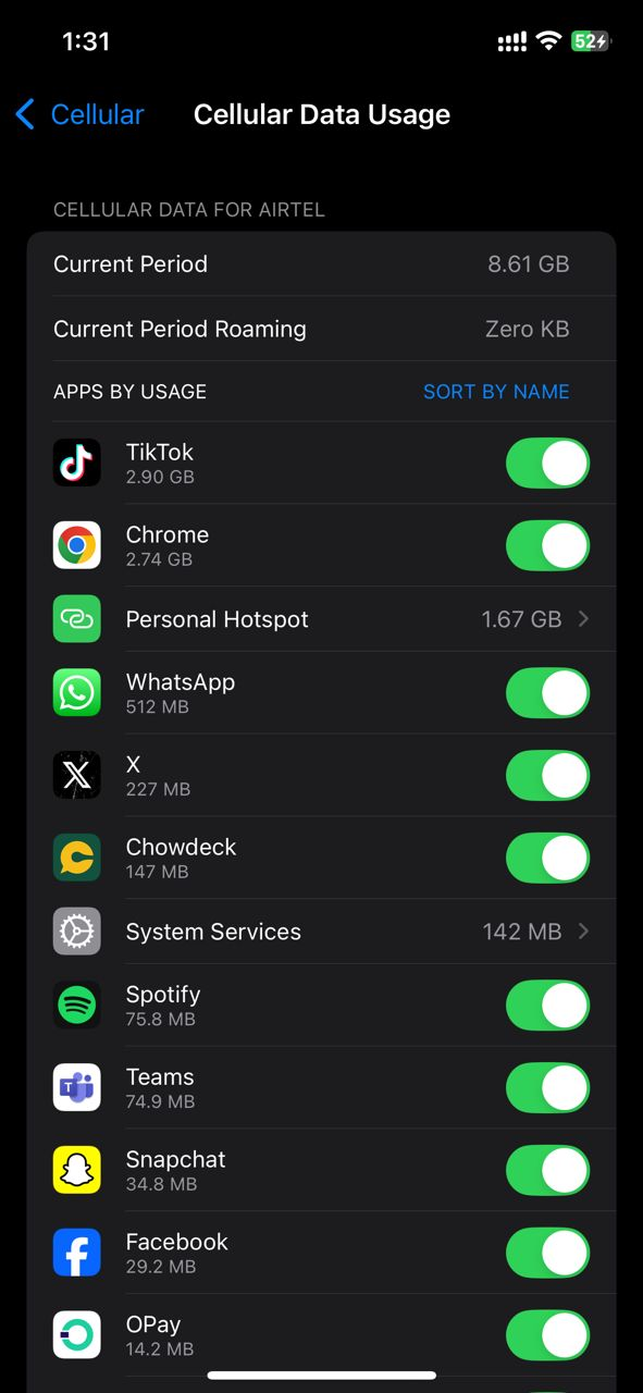 Step 4: You will see a breakdown of your data usage by app, including personal hotspot. Each app’s data consumption is listed below its name