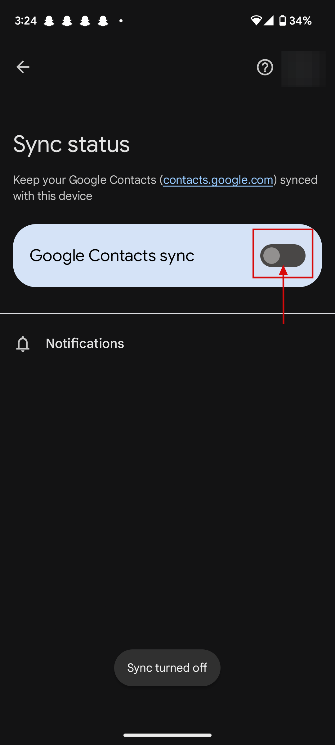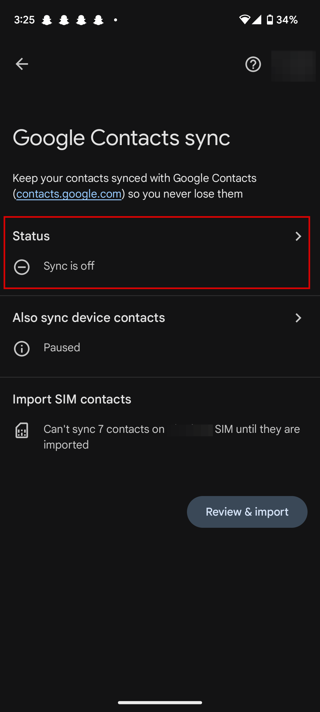 Step 4: If your Status shows synced, your contacts are synced to your Google account; if it shows sync is off, your contacts are not synced to your Google account