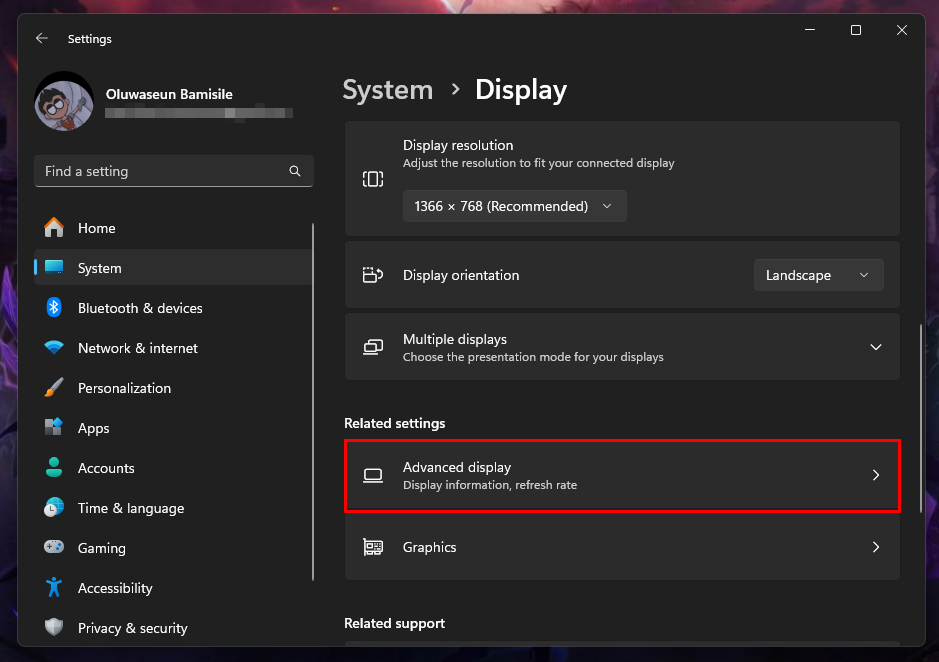 Step 3: In the Related settings category, select "Advanced display"