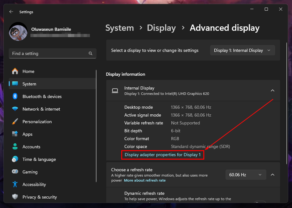 Step 4: Under "Internal Display", click "Display adapter properties for Display 1"