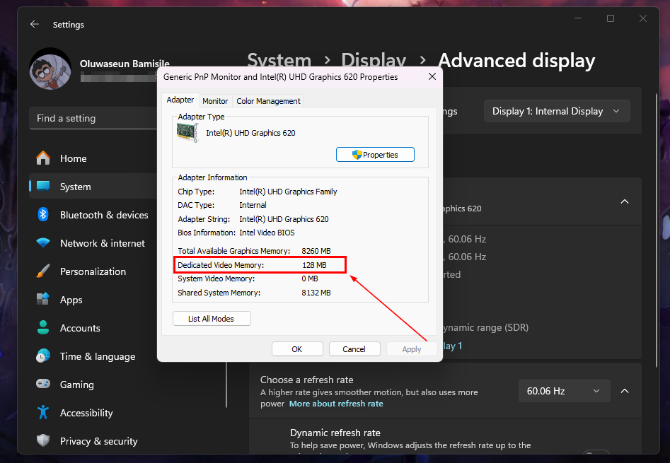 Step 5: On the Properties dialogue that pops up, you will see your PC's VRAM in the Adapter Information section