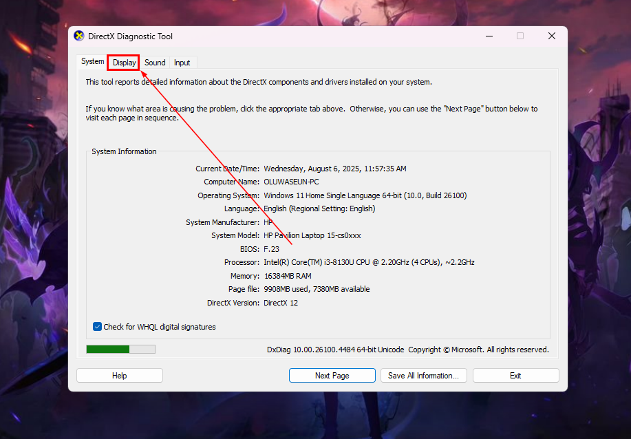 Steps to Check VRAM Through the DirectX Diagnostic Tool
