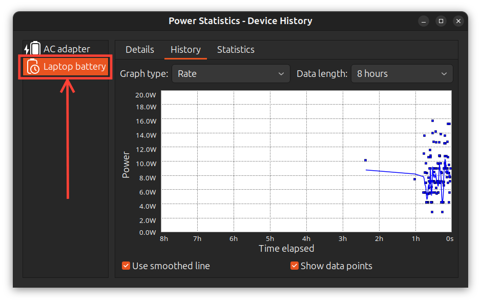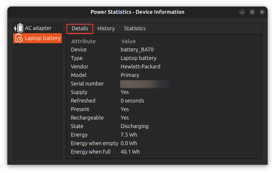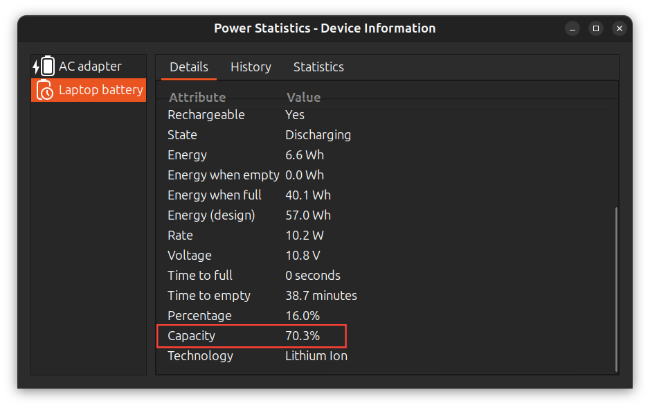 Inspecting your battery on Ubuntu is quite easy, but unlike your mobile phone, it’s not in the settings app; it’s in a hidden battery health checker called Power Statistics.