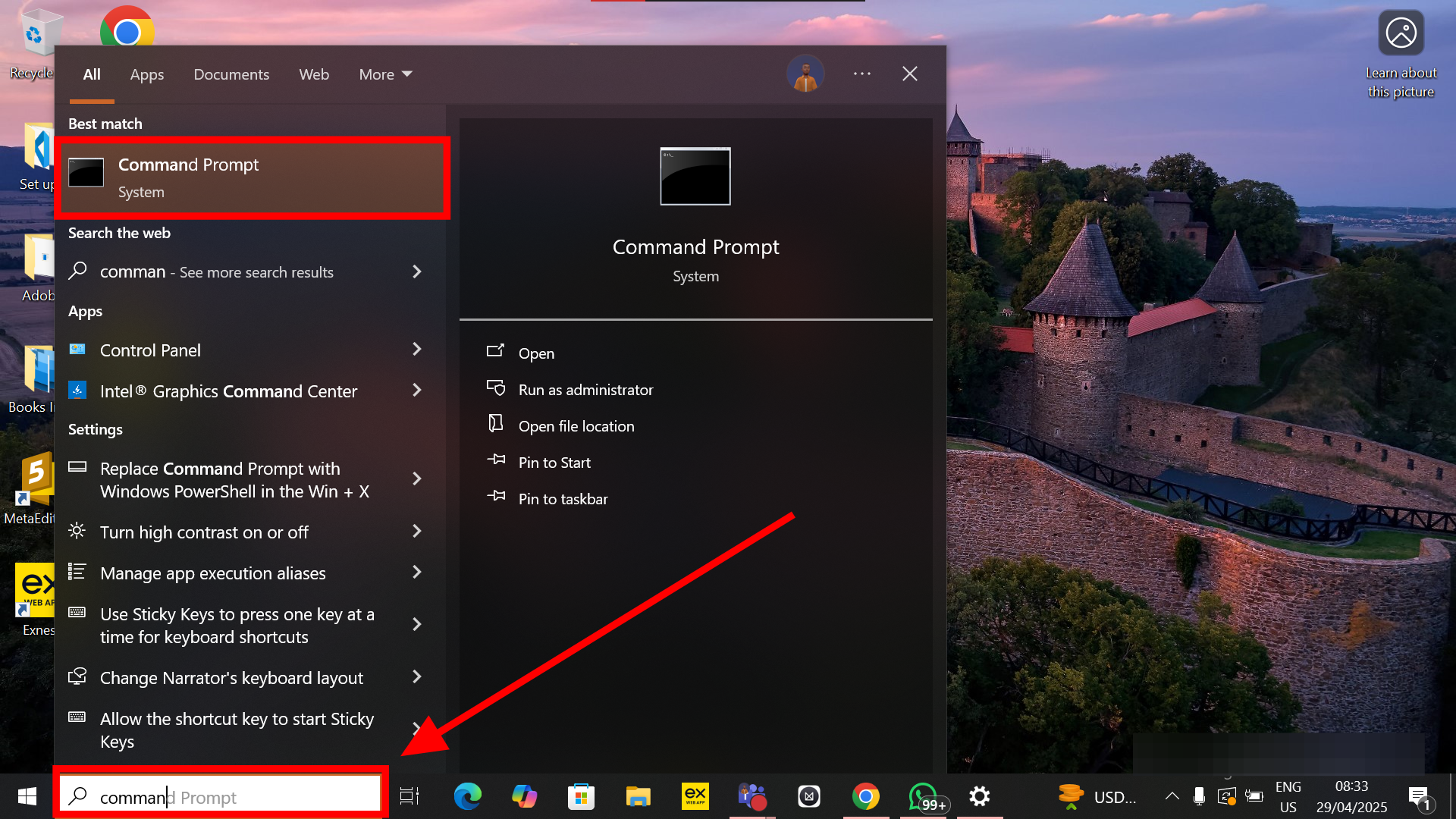 Step 2: Type “Command Prompt” in the search bar and select the app that appears.