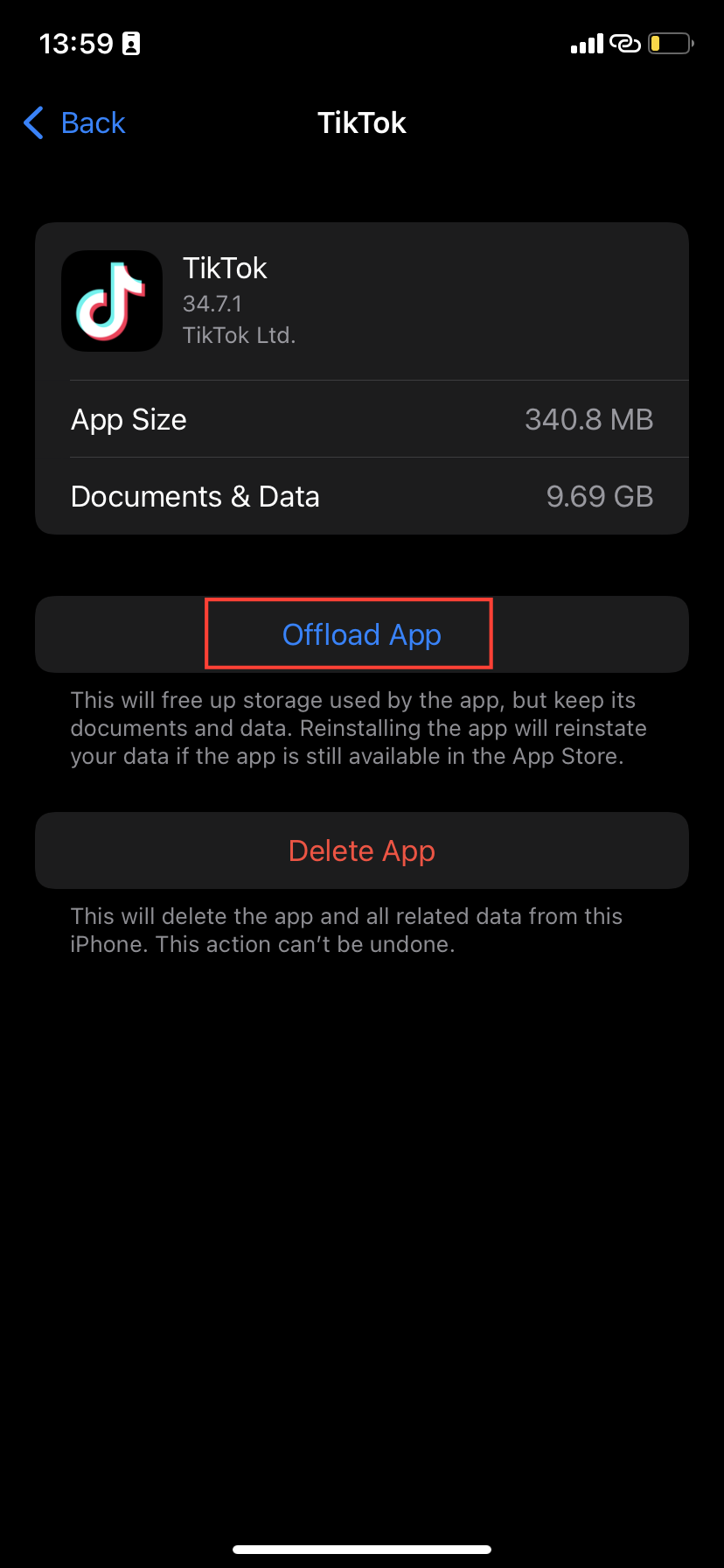 - If available, select Clear Cache or use the Offload App option to remove the app but keep its documents and data.
