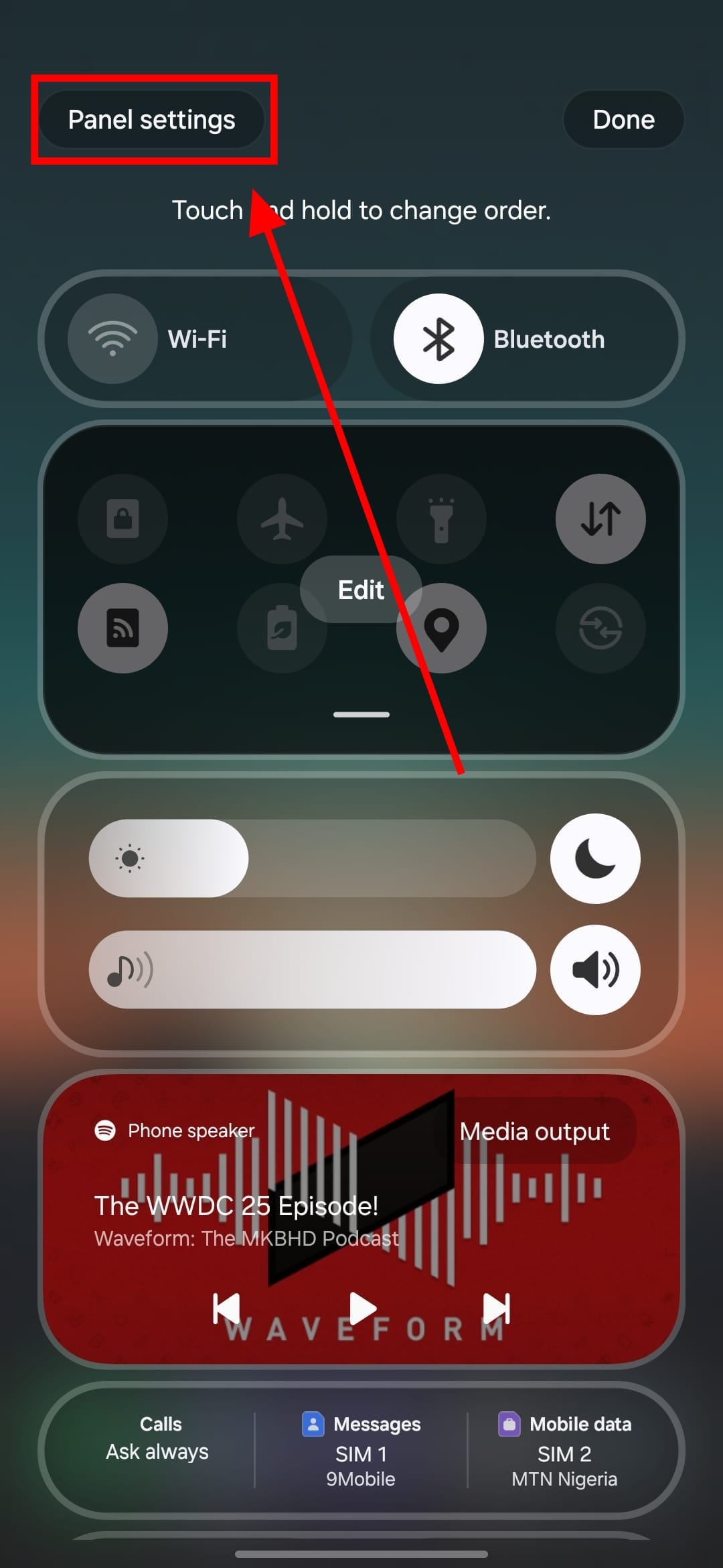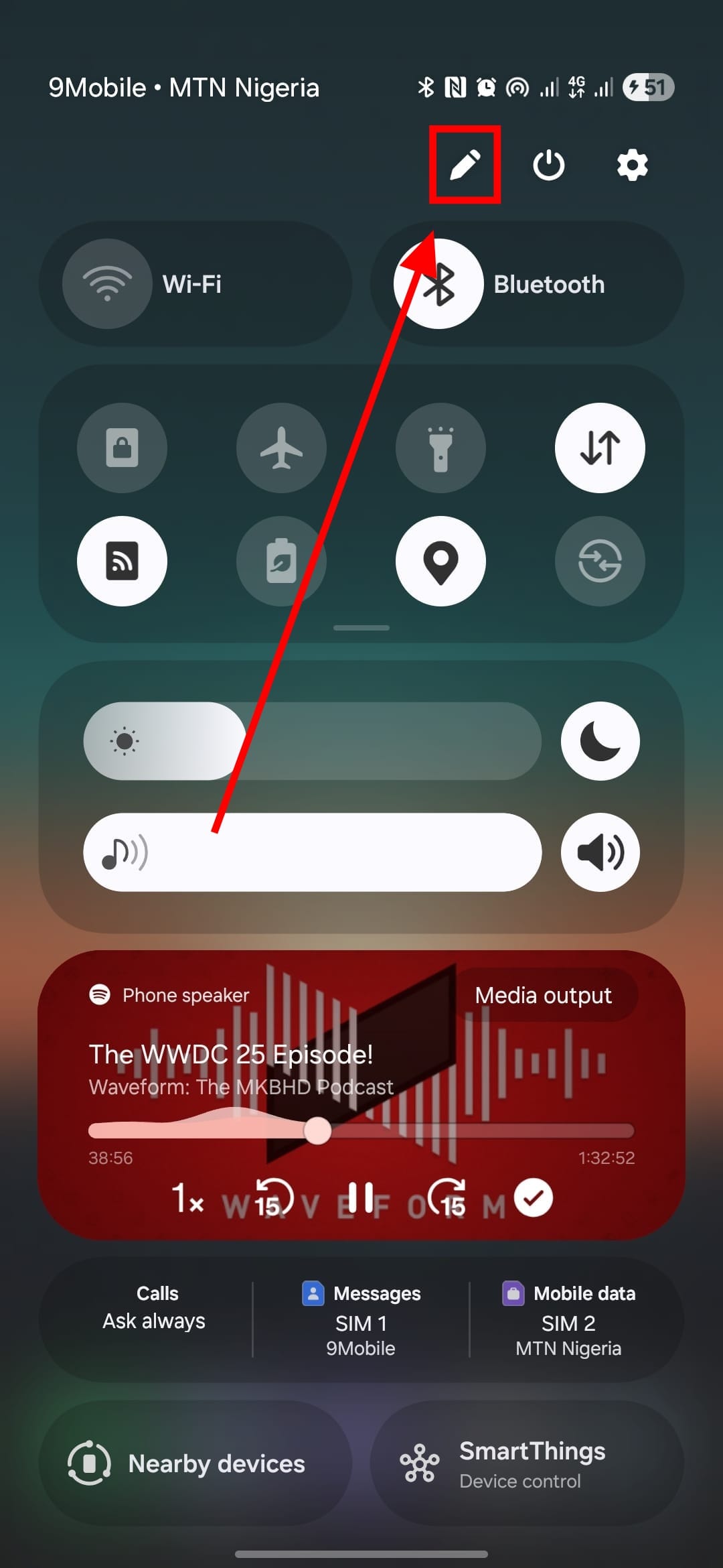 Step 1: Swipe down specifically from the top right corner to bring down quick settings, and then tap on the pen icon