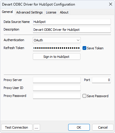 - Add a new data source: Click Add, select the Devart ODBC Driver for HubSpot, and click Finish. The driver setup dialog will open.