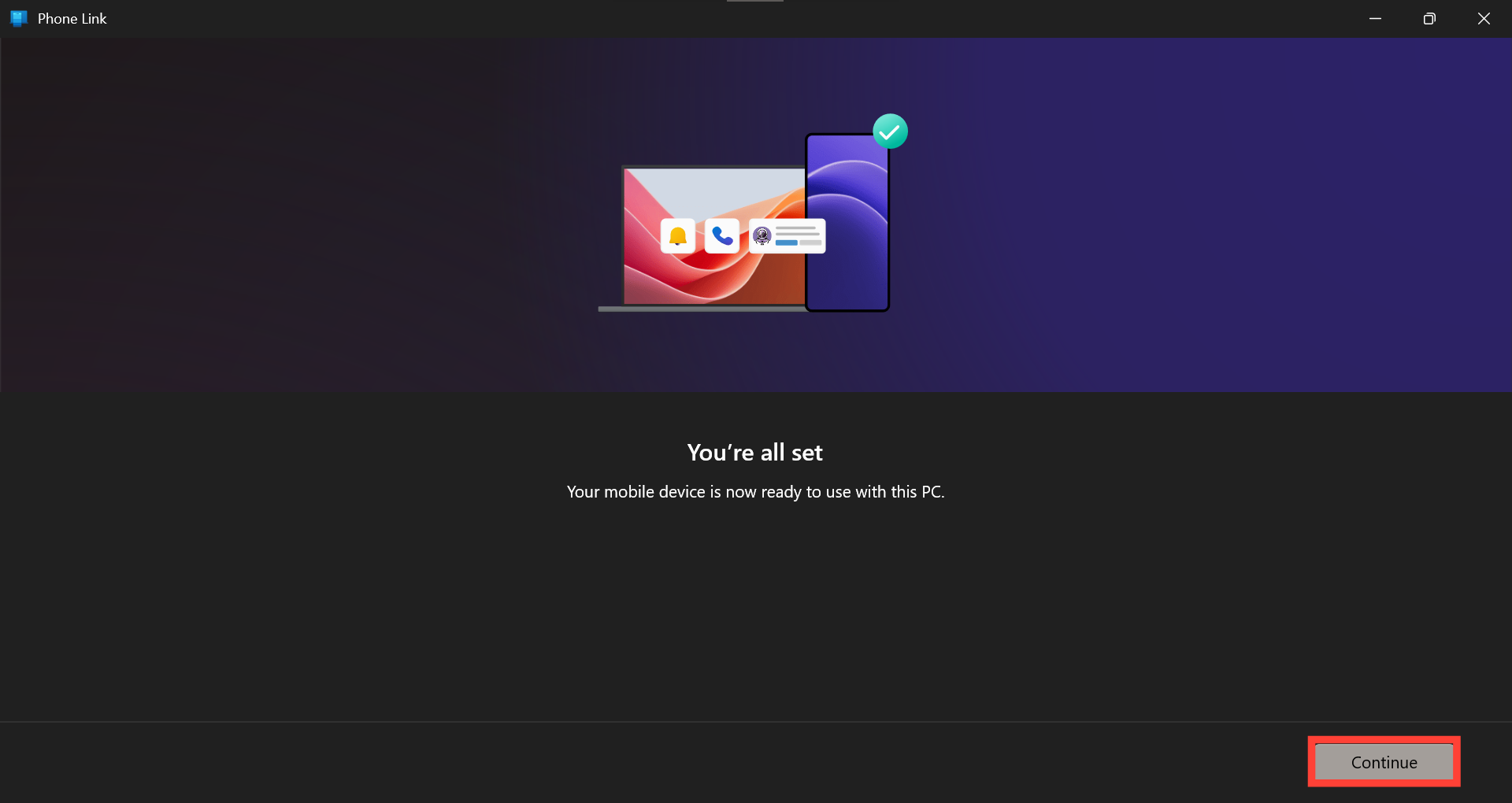 Step 7: On the Phone Link app on your Laptop, click "Continue." A connection will be established between your Laptop and Phone.