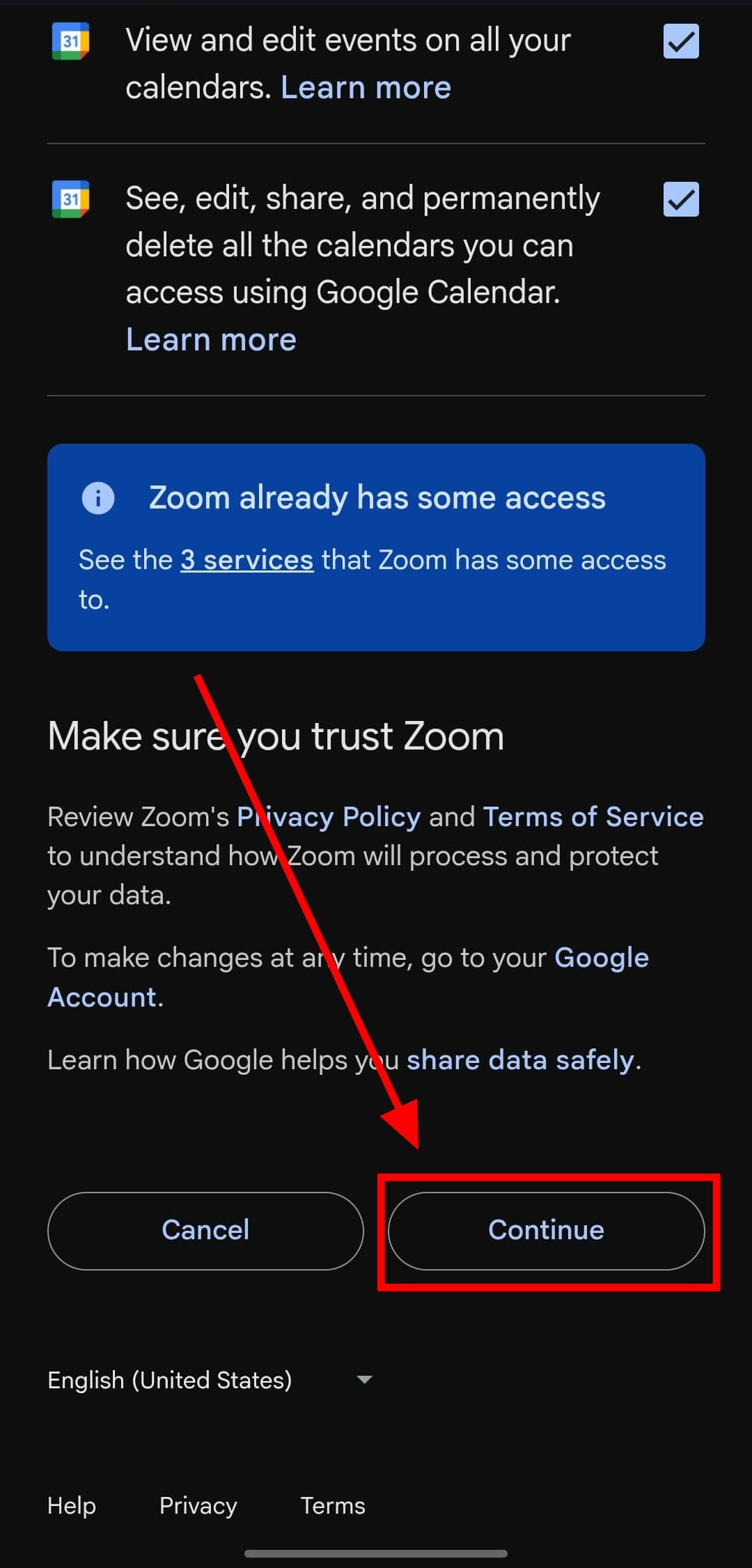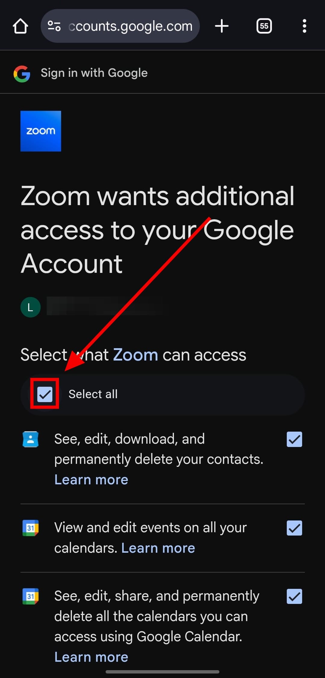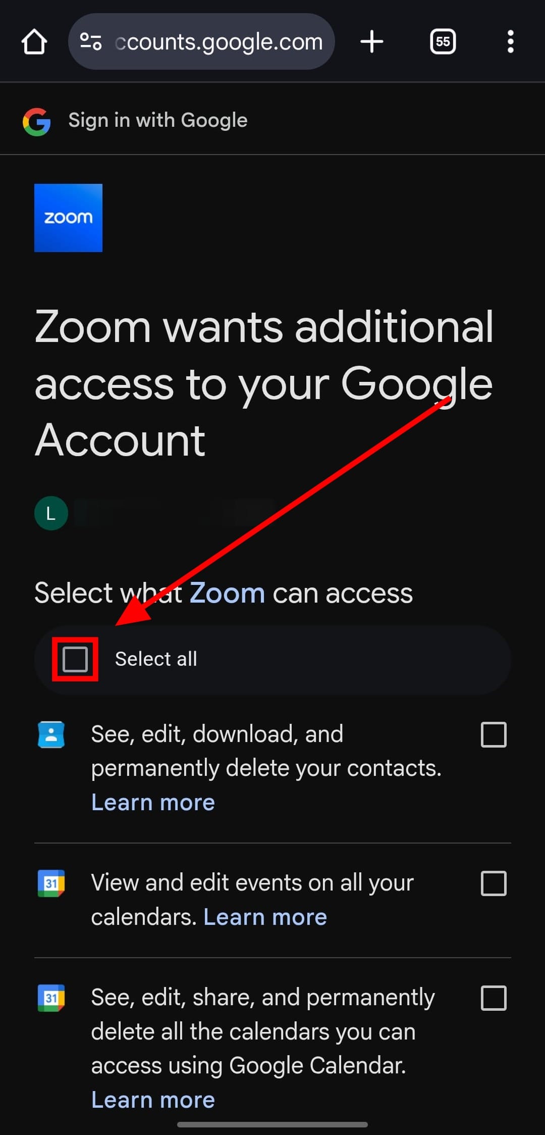 Step 6: After that, you'll be asked to grant Zoom access to relevant information from your calendar. Tick the box labelled 'Select all' to allow this.