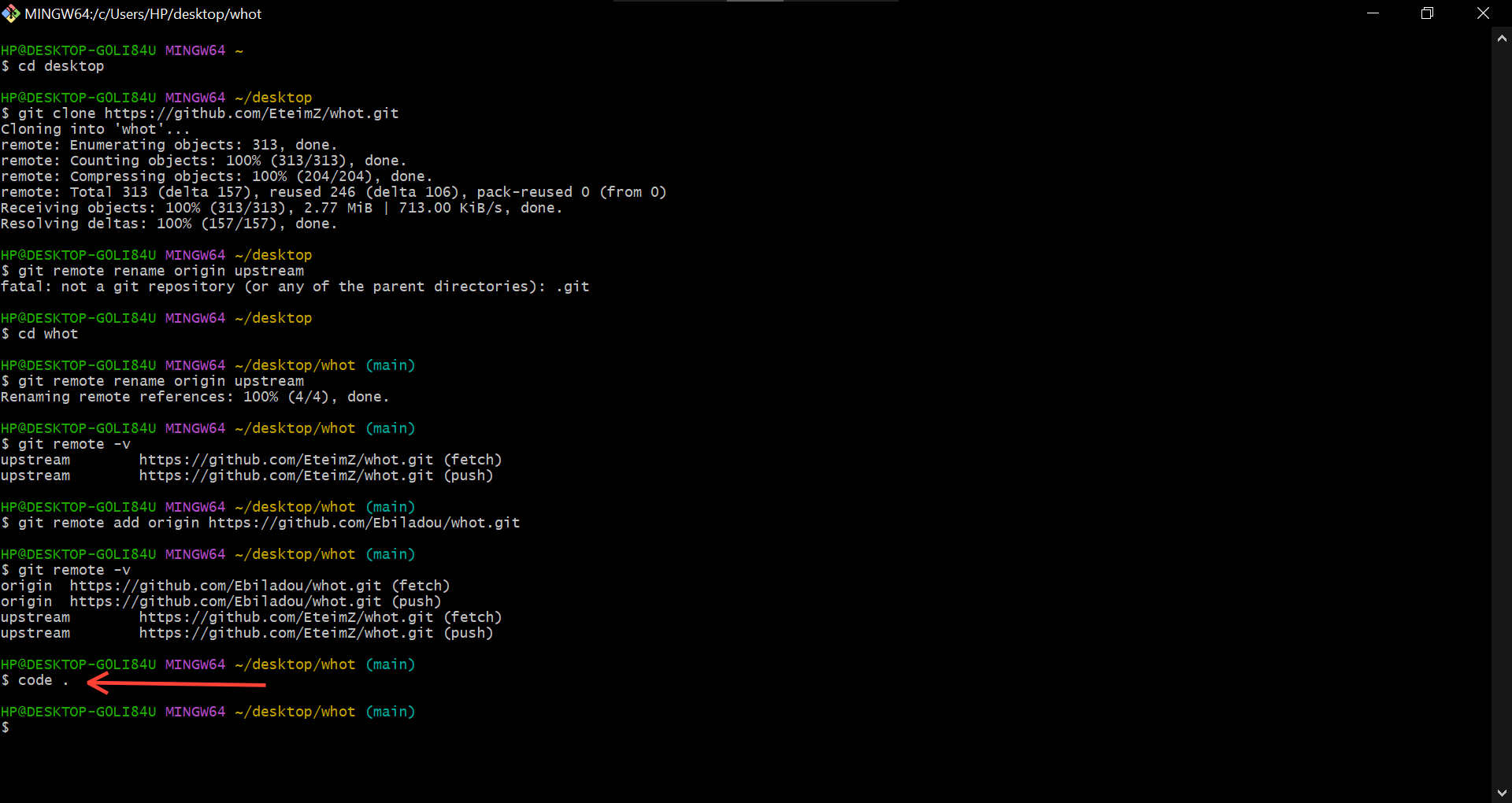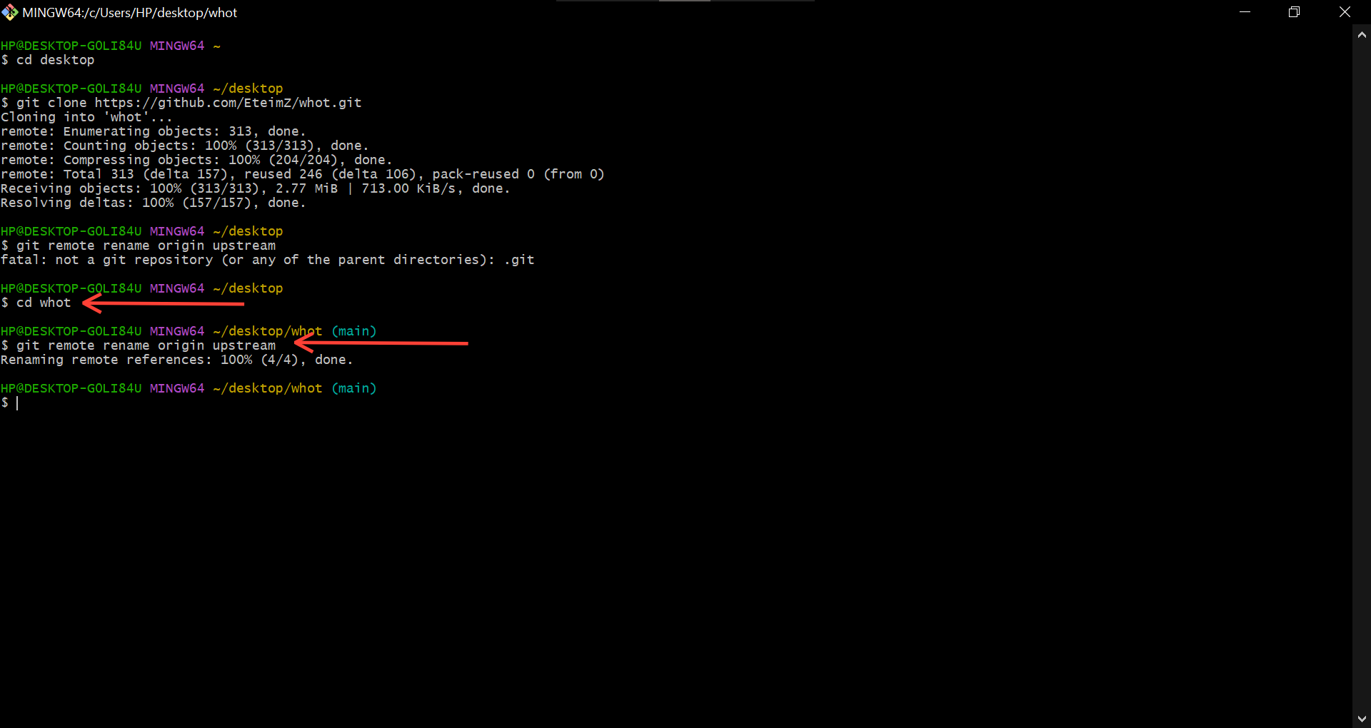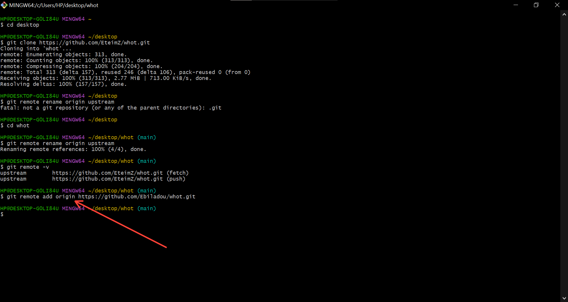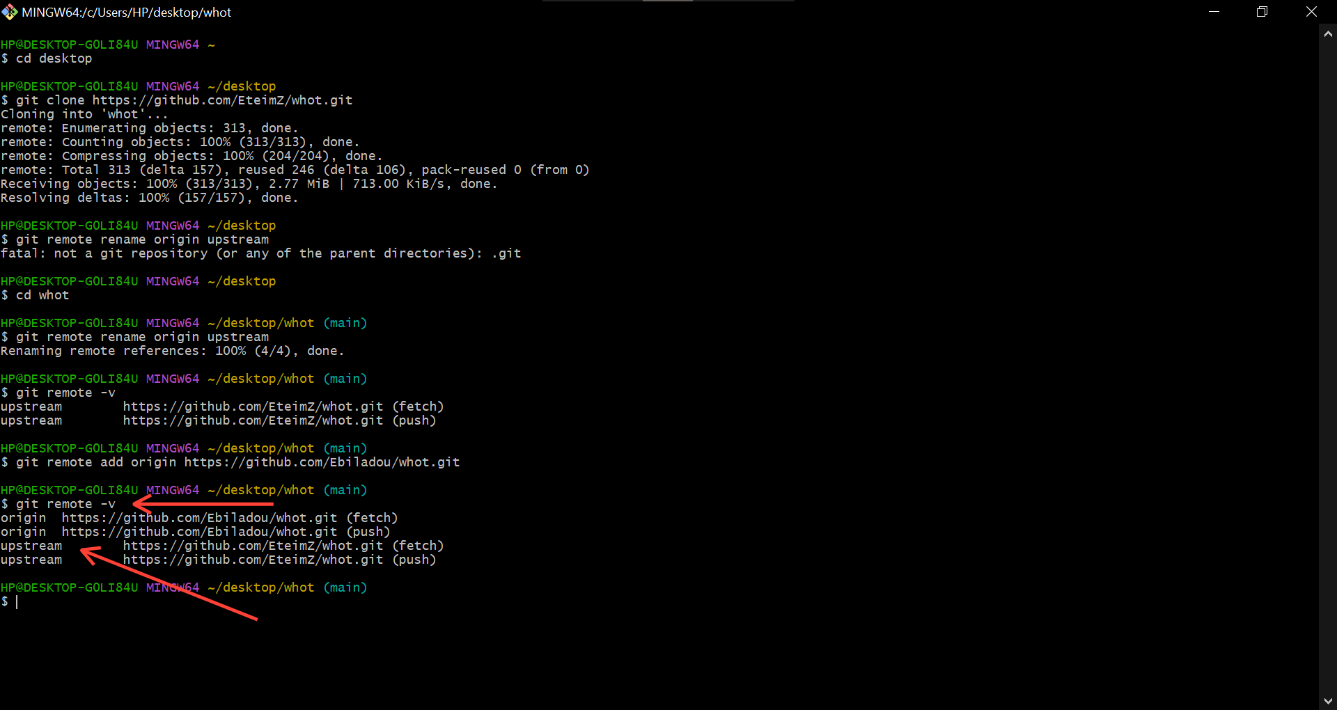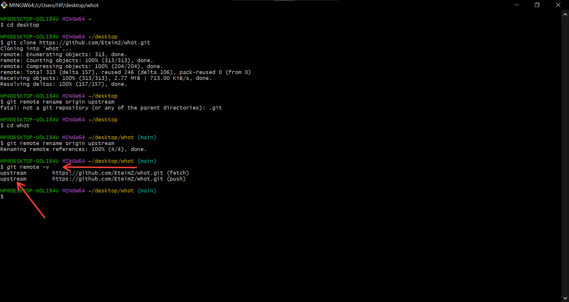 To confirm that it has been renamed, run the command git remote -v. You should see "upstream" prefixed to the repository URL.