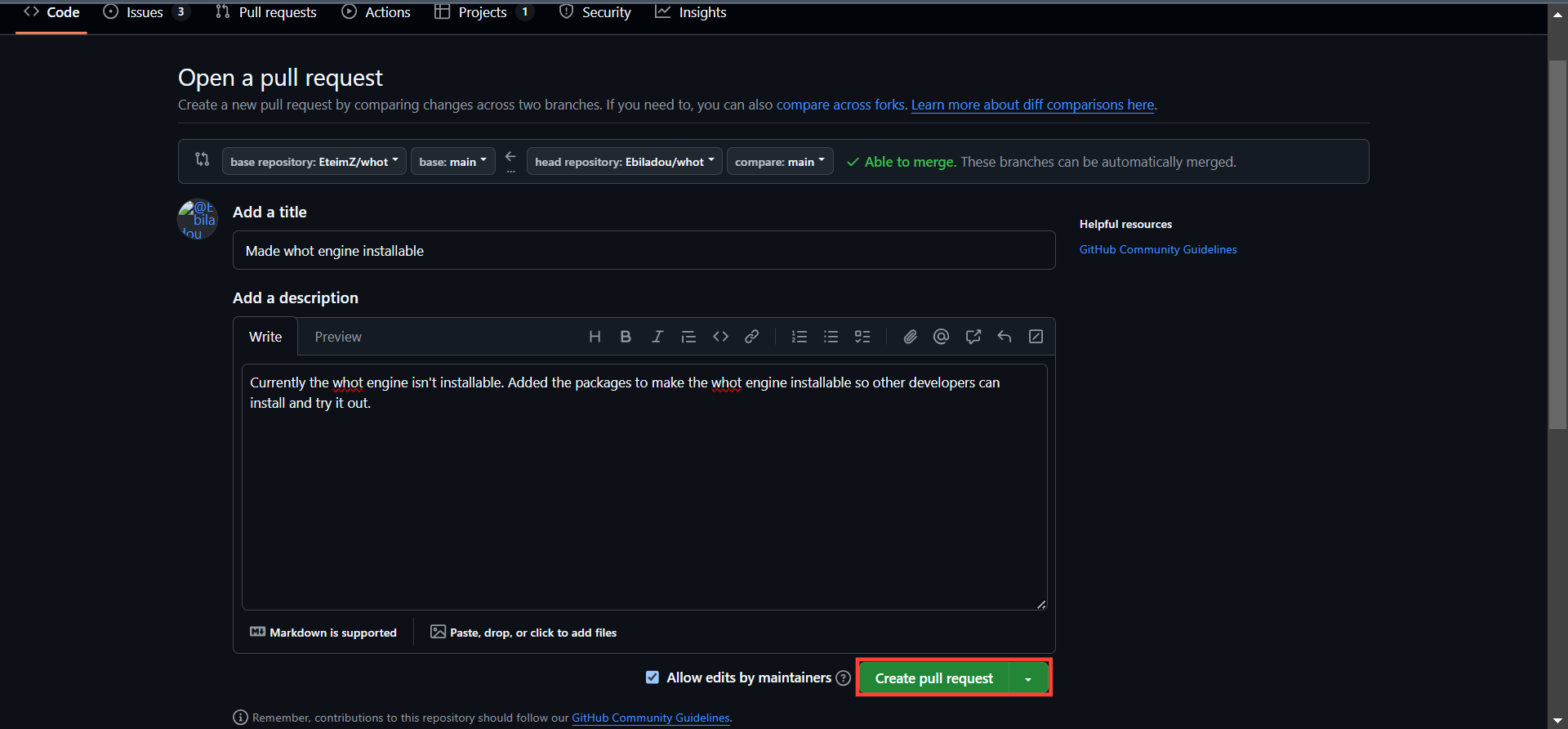 - Fill in the pull request title, description, and any other required information, and then click on the "Create pull request" button to submit the request. That is all, if approved, the changes will be merged with the original repository. If rejected, you can you can revise and resubmit your changes.