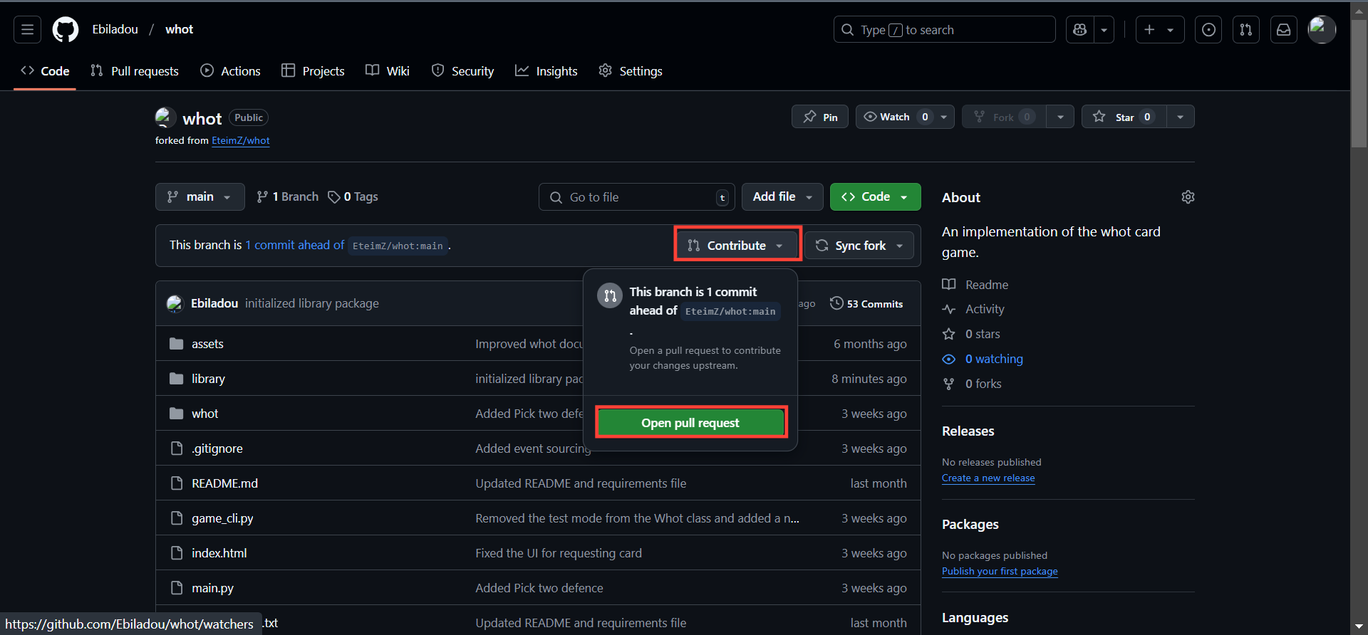 - At the top, you'll see you're ahead of the original repository, click the "Contribute" dropdown menu and click "Open pull request"