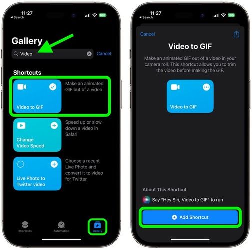 - Search for 'Video to GIF while in the Gallery tab, then Tap Add Shortcut in the result provided.