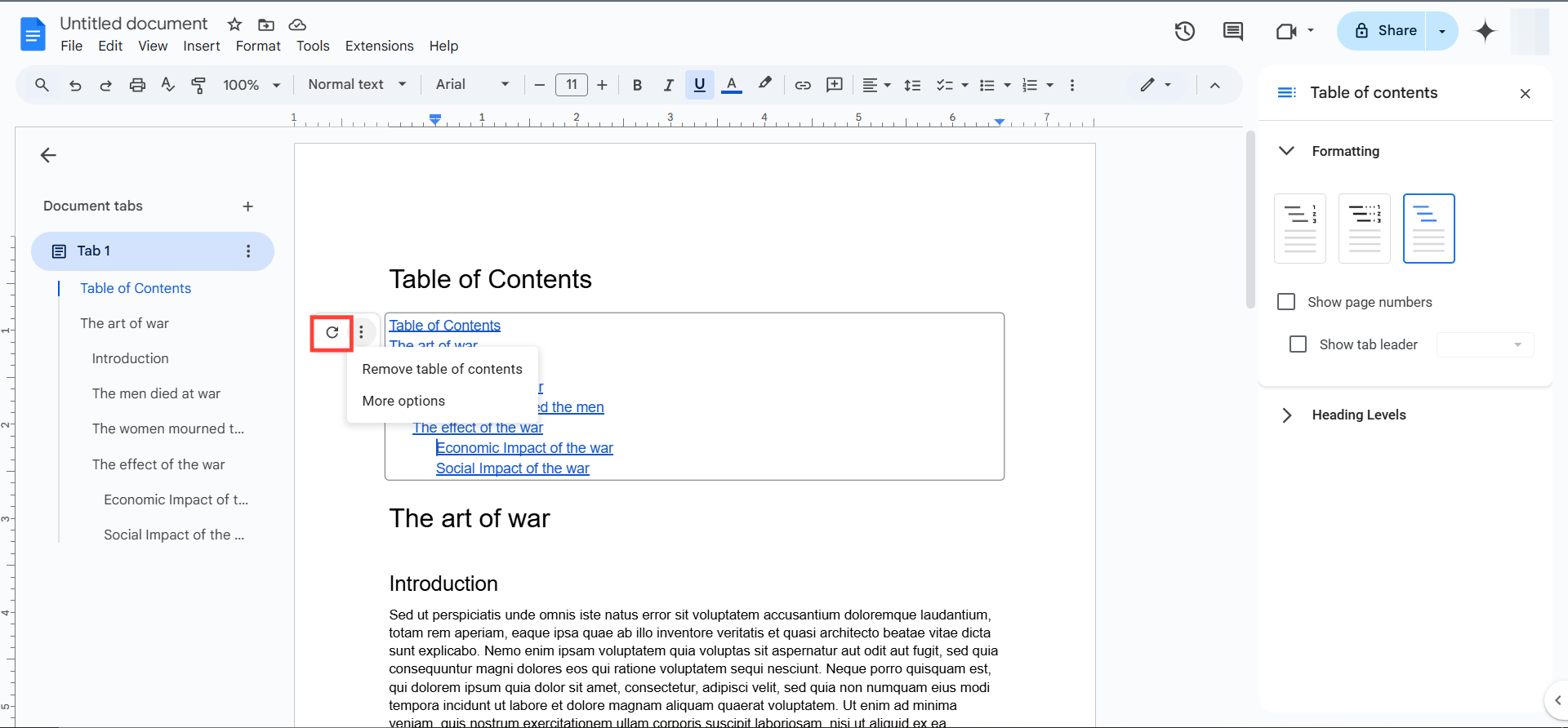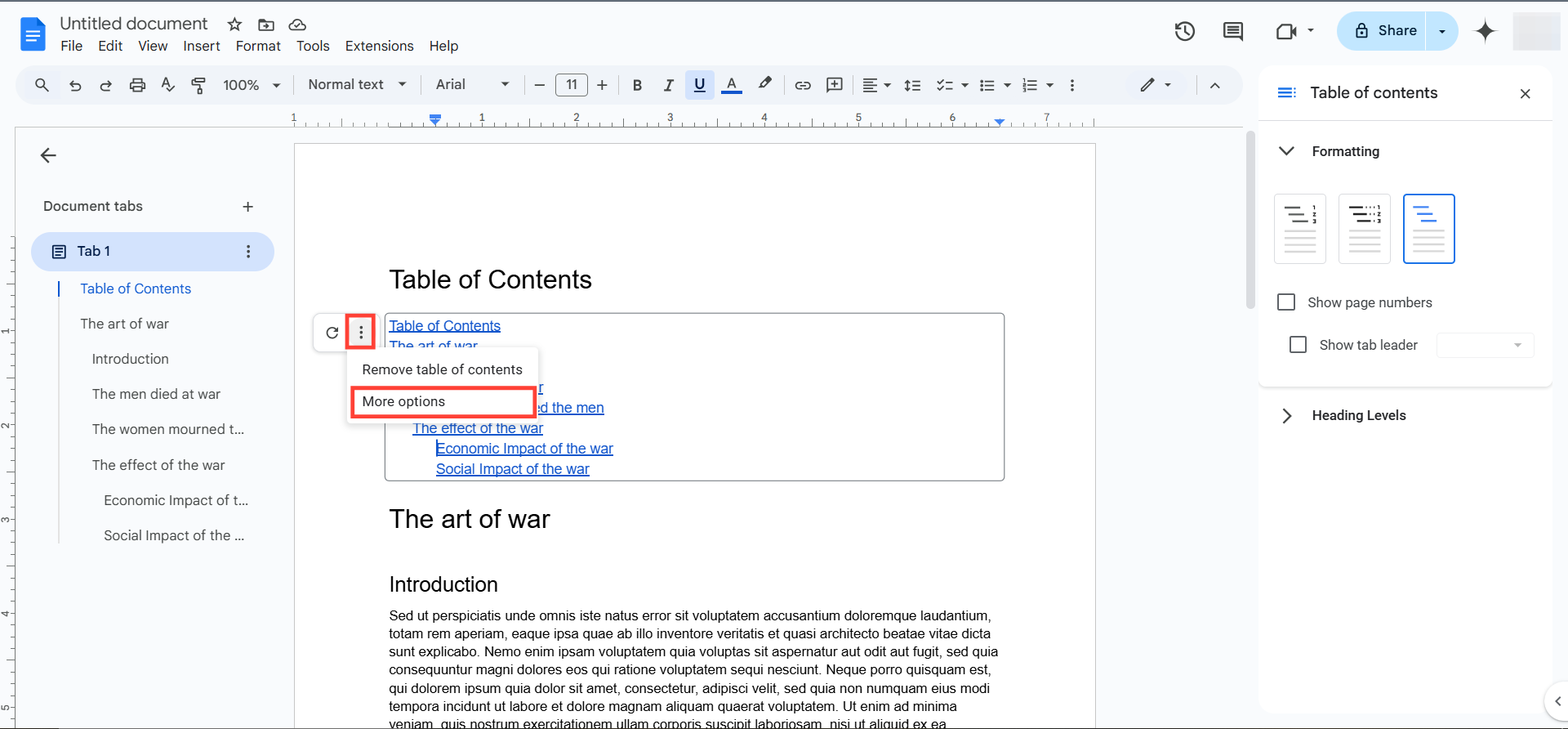 - For further adjustments, click the table of contents, click the three dots, and select More options.