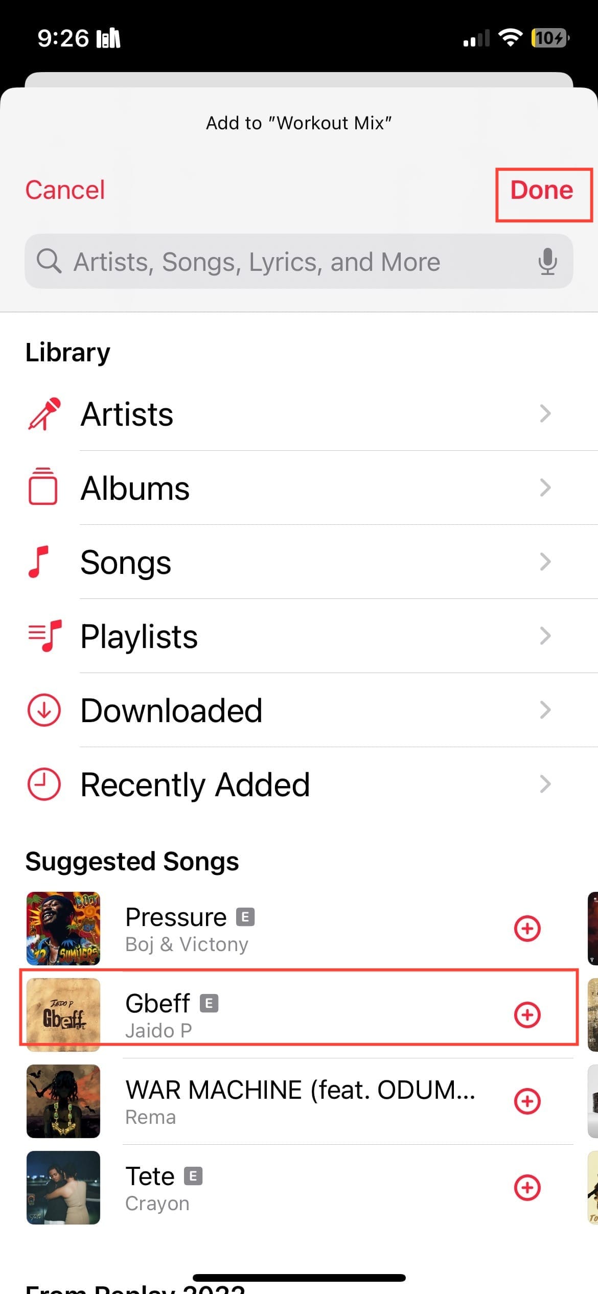 After selecting your songs, tap Done (or the checkmark icon) to save your playlist. Your new playlist will now be available in your library's "Playlists" section.