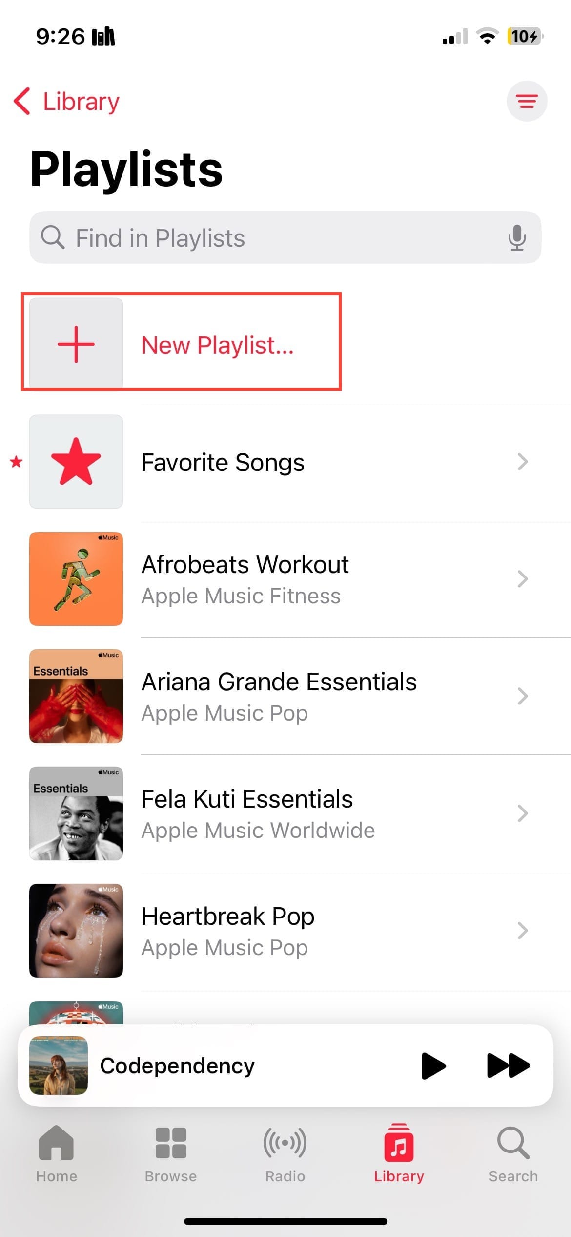 Within your library, tap "Playlists". Then, tap "New Playlist" at the top to start a new playlist.