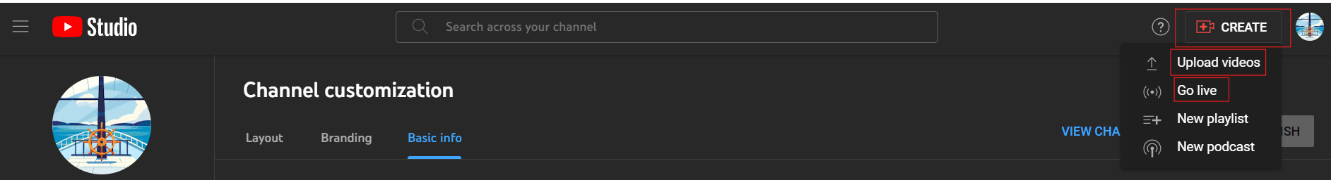 Step 4: To start sharing content on your channel, click the "Create" button. A drop-down list will appear, then click on "Upload videos" or "Go live." You can select a video file from your computer to upload. While your video uploads, you can add a title, description, tags, and other details.