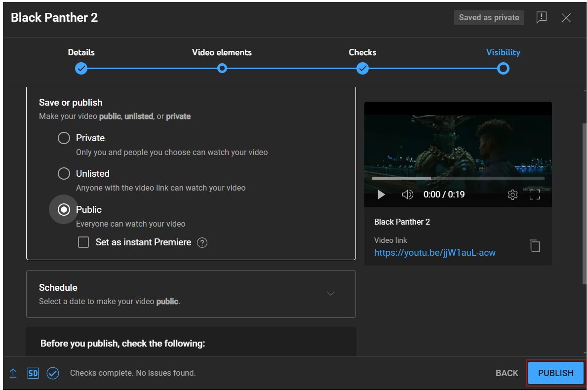 Step 6: Once you've added all the necessary details and settings, click the "Publish" button to make your video live on your channel. After publishing your video, share it with your audience by copying the video link and sharing it on social media platforms or embedding it on your website.