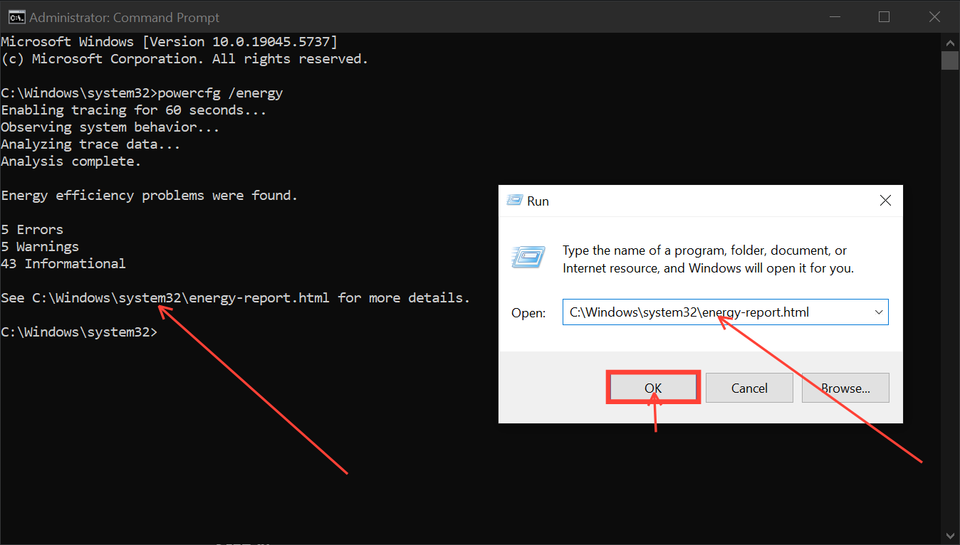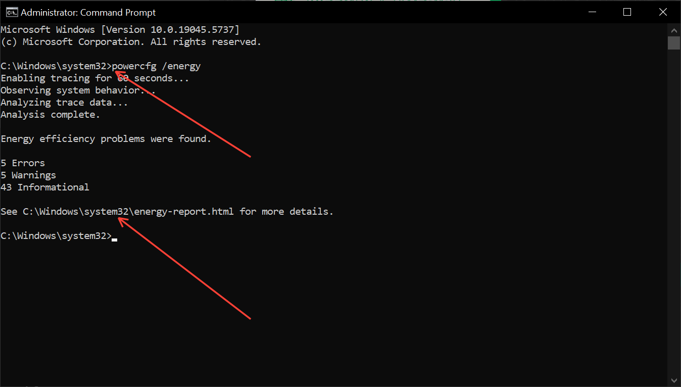 Step 2: Type the command "powercfg /energy" and hit the Enter key. This will generate the report with the path to where it is stored. Take note of the path as we will use it in reviewing the report.