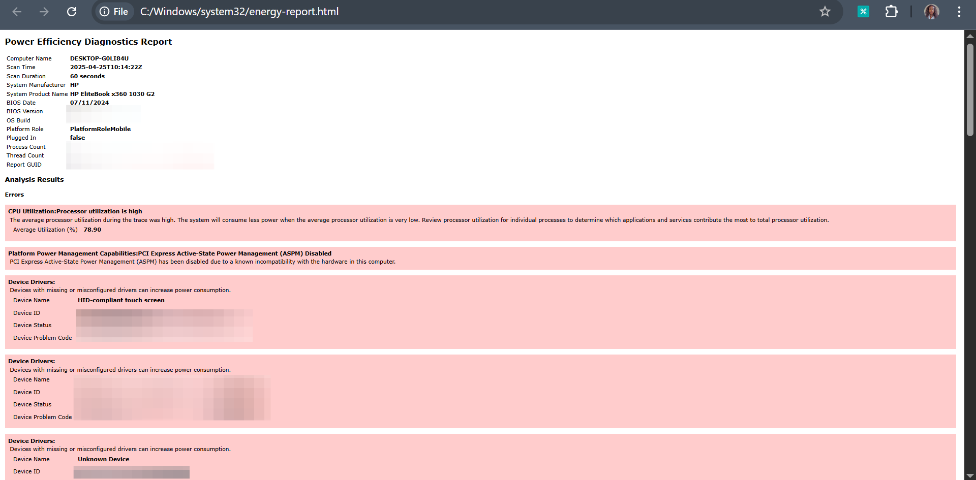 Step 3: This will open the power efficiency report in your default web browser, providing a detailed analysis of system issues, categorizing findings into errors, warnings, and information to help identify configuration problems.