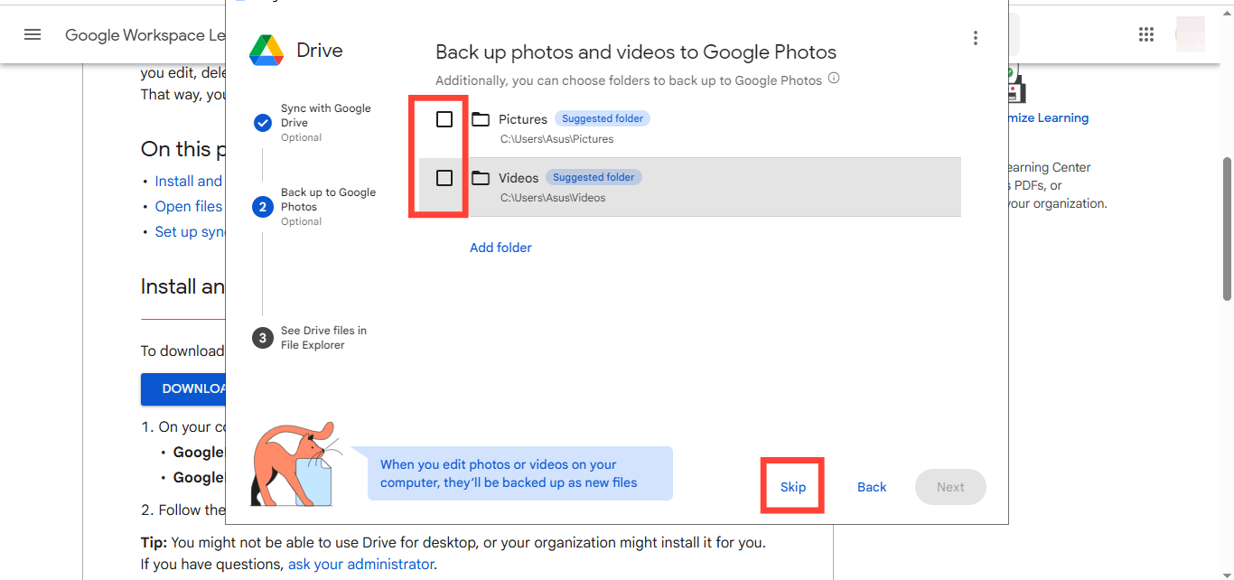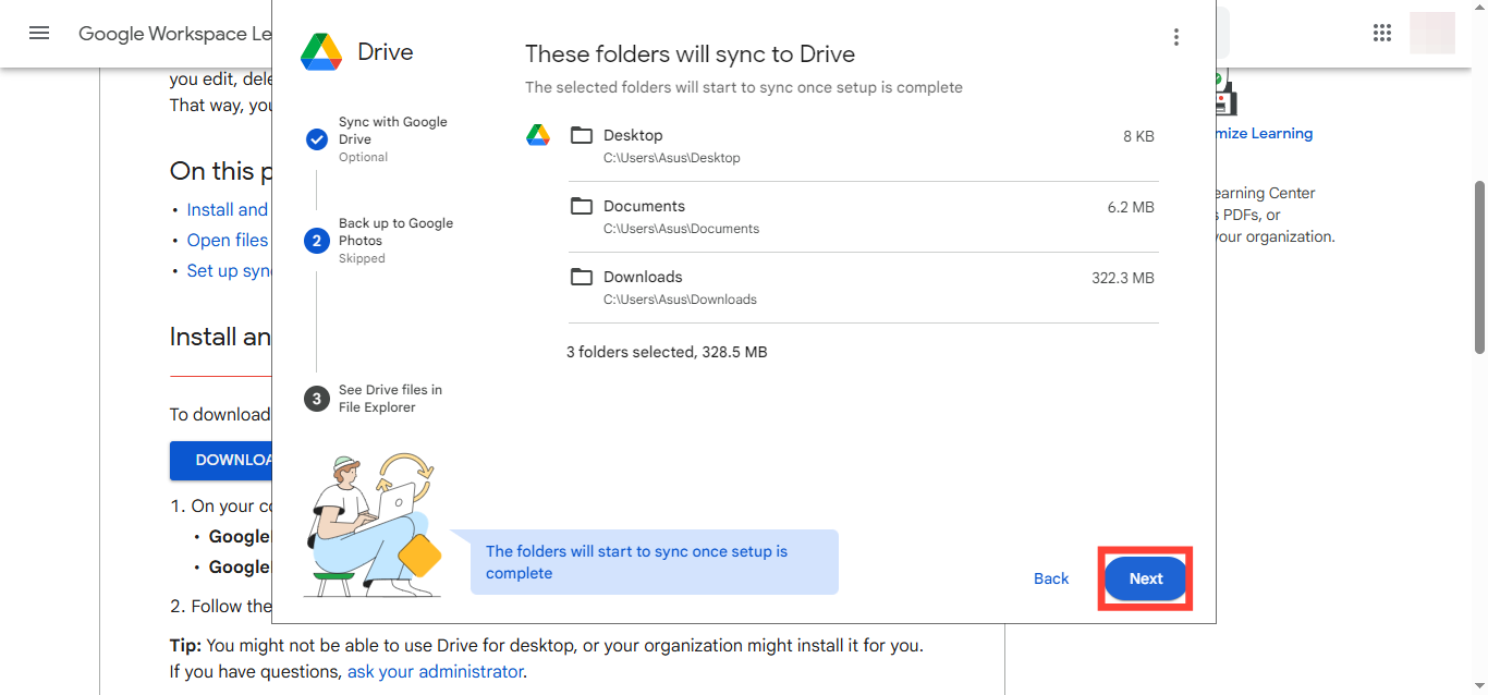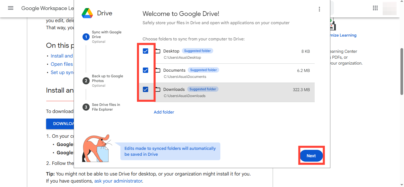- Choose which folders you want to sync from your computer to the Drive and tap "Next"