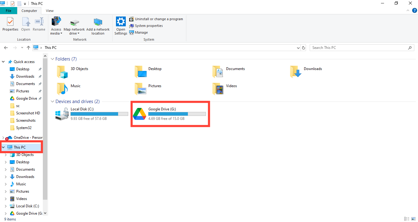 Step 2. Tap on "This PC" and click on "Google Drive" beside your local disk to access your files.