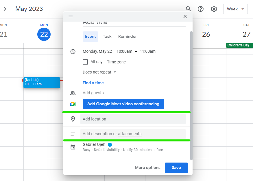 7. You can decide to add a Location and even add a Description or attachments for the event.