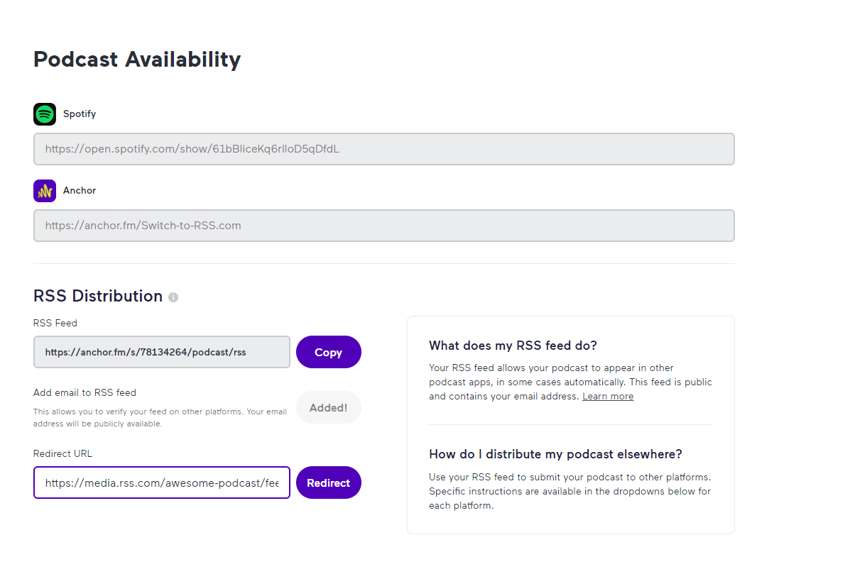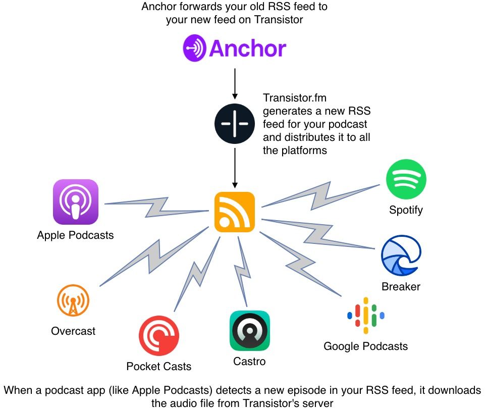 The RSS feed gives distribution on Apple Podcasts, Google Podcasts, Overcast, Amazon Music, iHeartRadio, Castbox, Pocket Casts, Radio Public, and Stitcher – all platforms affiliated with the Anchor platform.