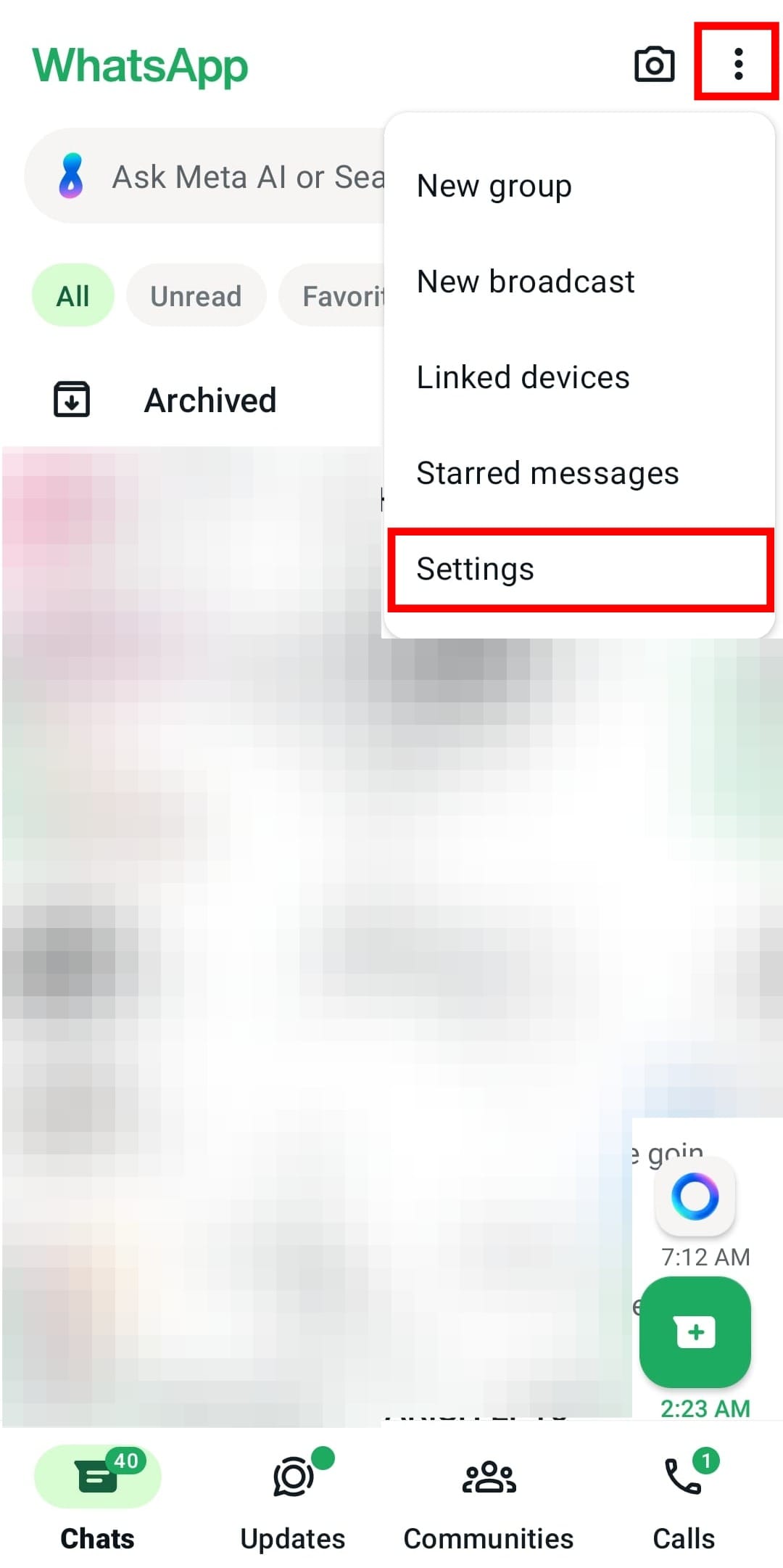 - Open your WhatsApp click the three dots at the top right and go to "Settings".