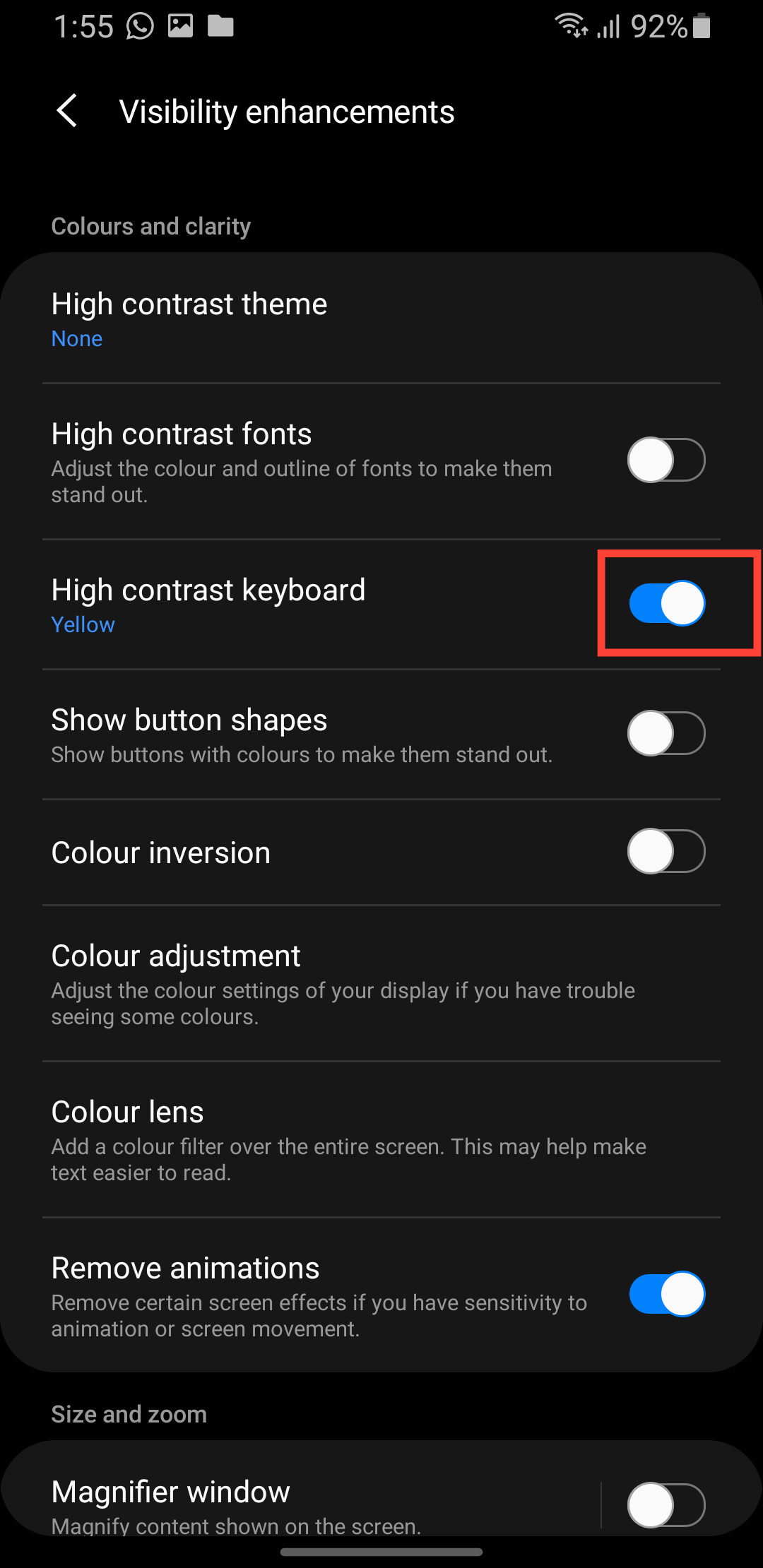 Step 4: To enhance keyboard readability, toggle on High contrast keyboard, which changes keyboard colors for better visibility.