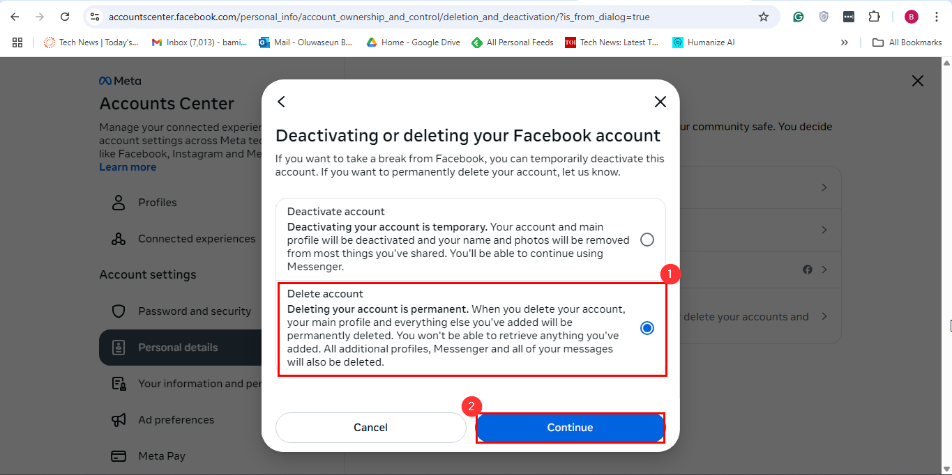 Step 9: Select the Delete account option and click "Continue." Then, follow the on-screen instructions to delete your account