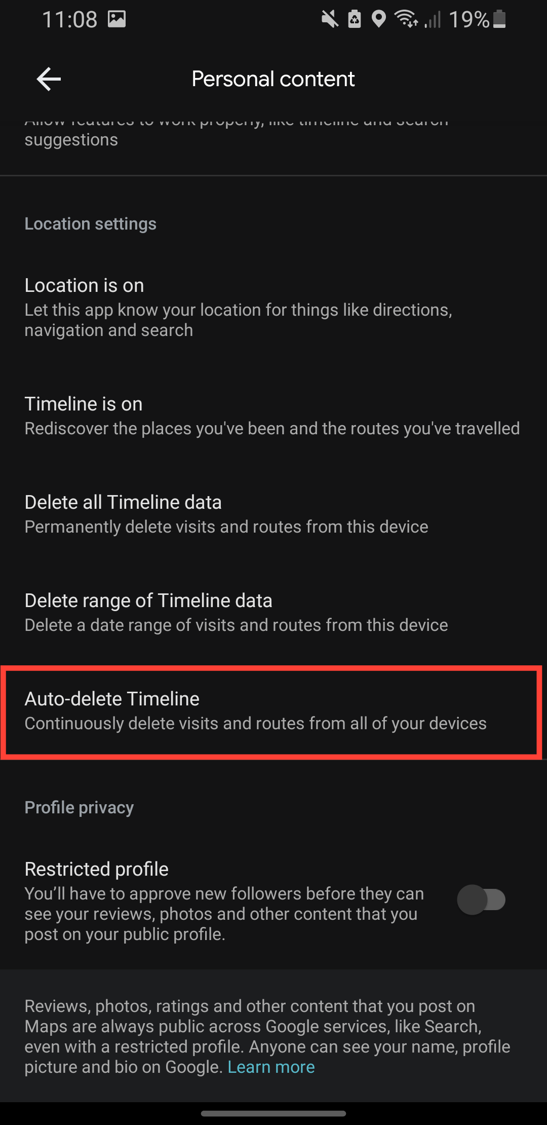 - Select "Auto Delete timeline" to continuously delete the location data logged.