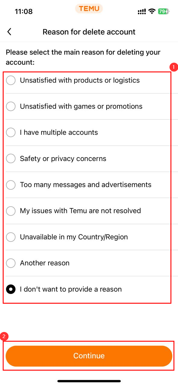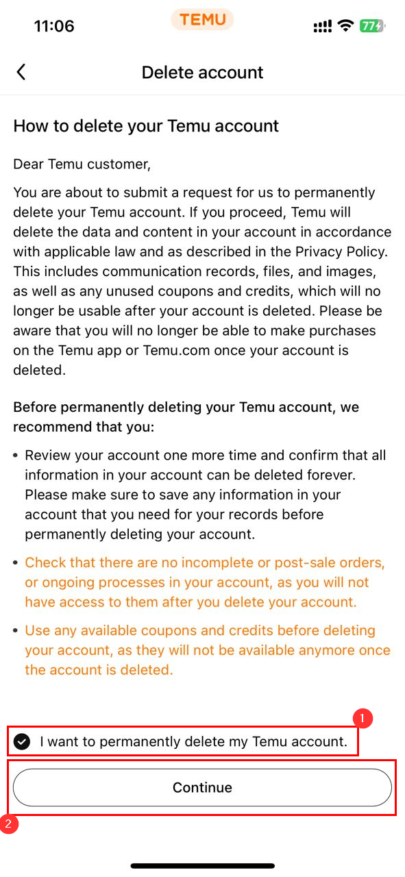 Step 5: Select "I want to permanently delete my Temu account", then click the Continue button