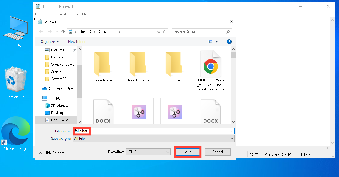 Step 4. Rename the file with a ".bat" extension and tap "Save" (e.g. Fake.bat).