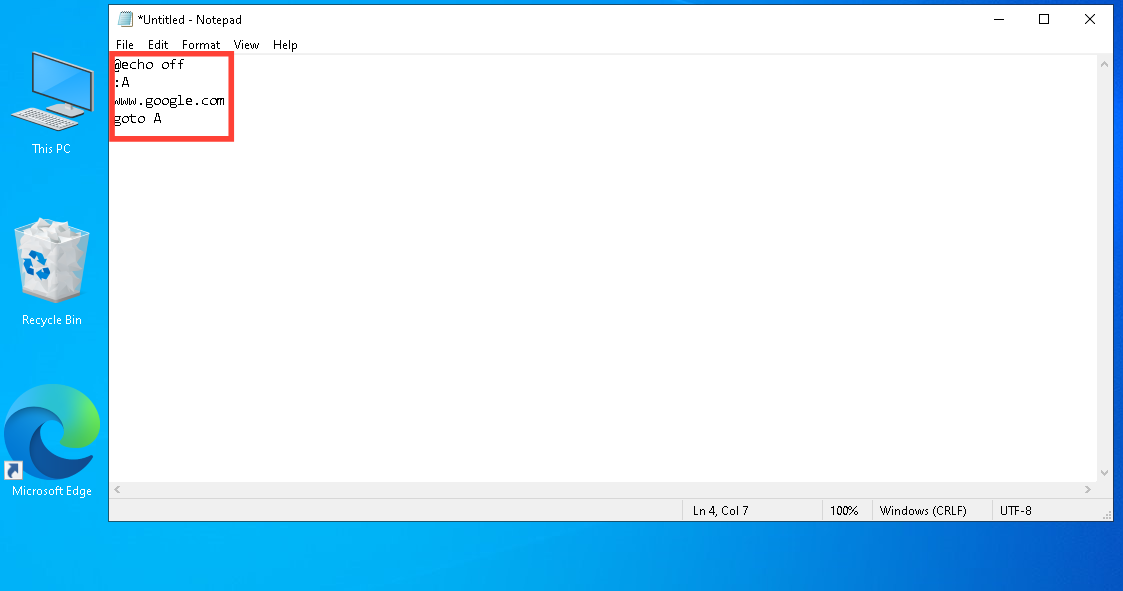 Step 5. Once the file is saved, locate it on your desktop and double-click to run it. This will create a continuous loop on the PC, mimicking a virus.