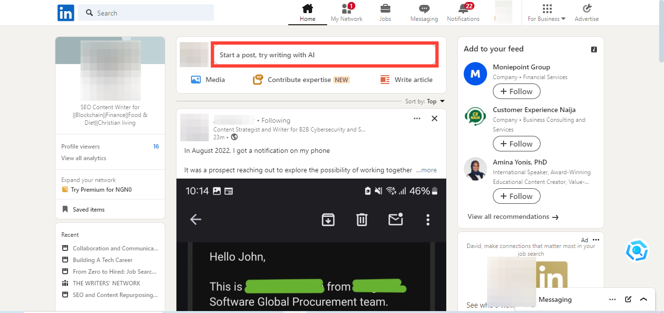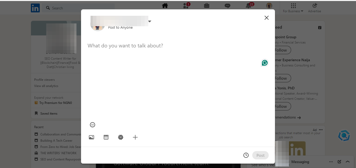 Step 1. Click "Start a post" at the top of your LinkedIn homepage. This will open the "Create a post" pop-up window.