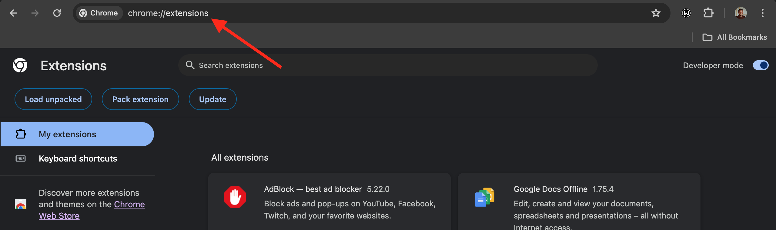 Next, type chrome://extensions/ in the address bar and press Enter. You'll see all your installed extensions displayed.