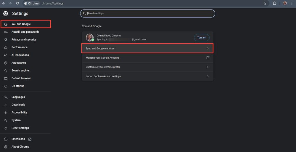 Step 2: Click "You and Google" on the left, and select "Sync and Google services" on the right panel.