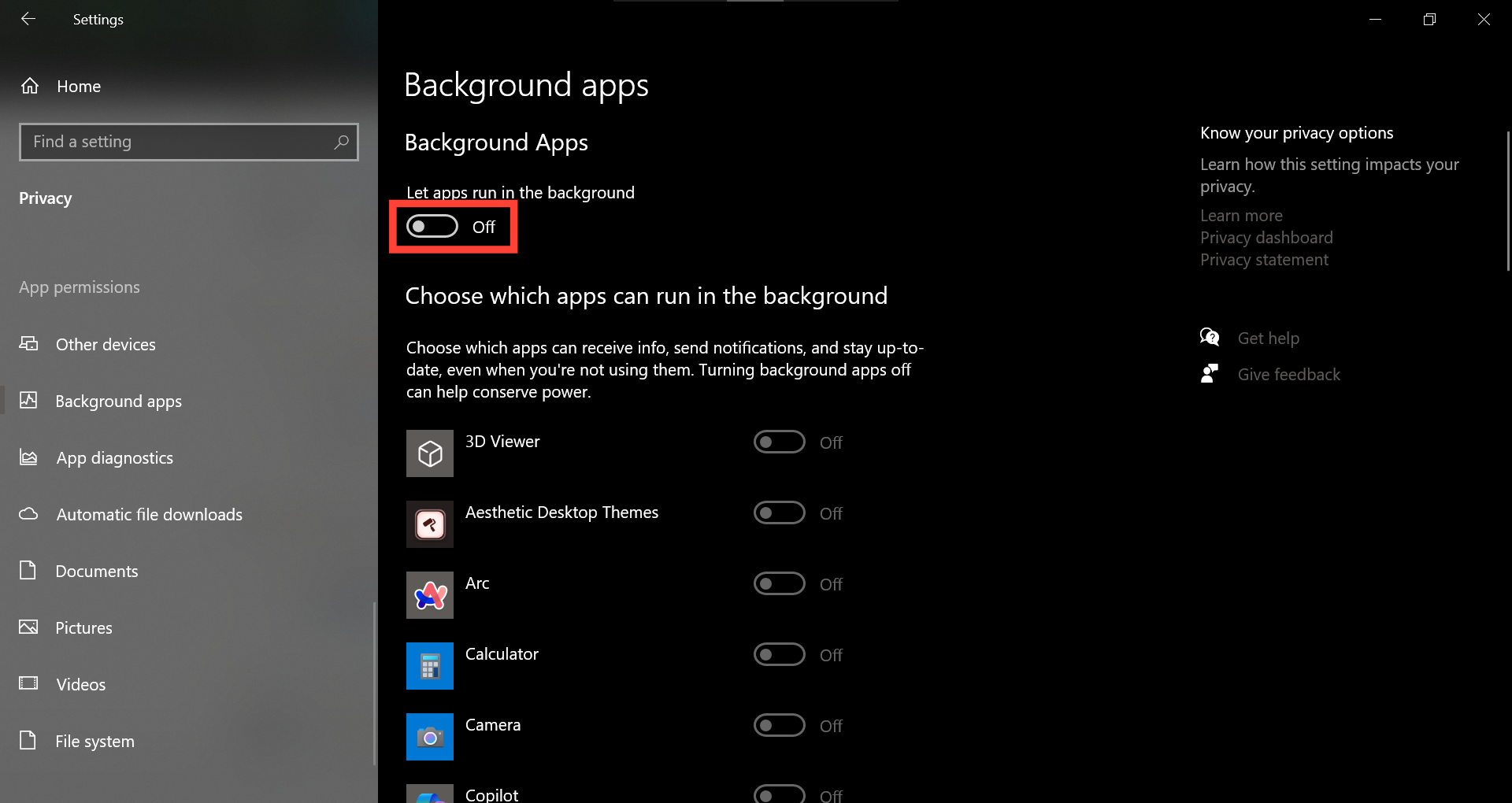 Step 4: Under "Background Apps," toggle off "Let apps run in the background." This will stop all apps running in the background.