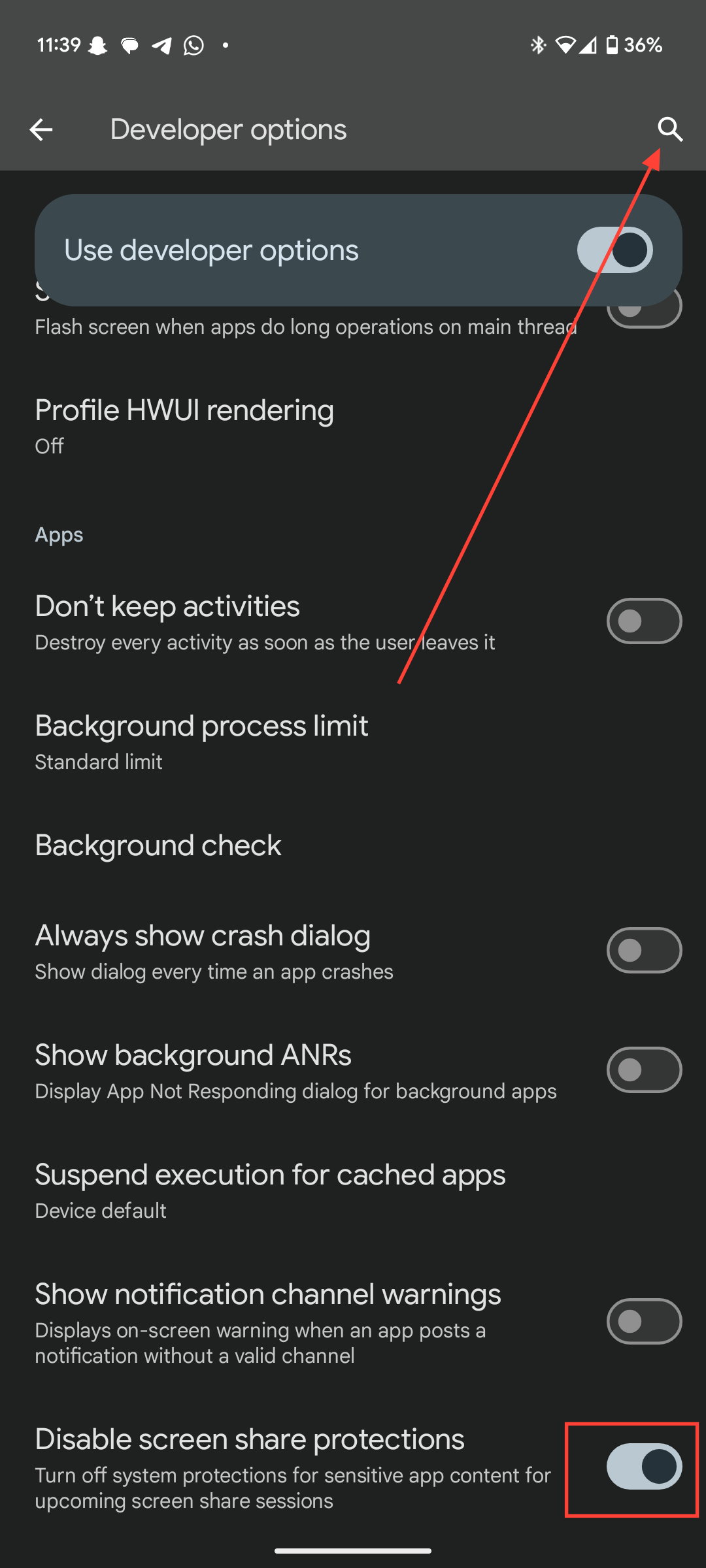 Step 5: Either use the search icon at the top, or scroll and find "Disable screen share protections." Once you find it, toggle on the switch next to it.