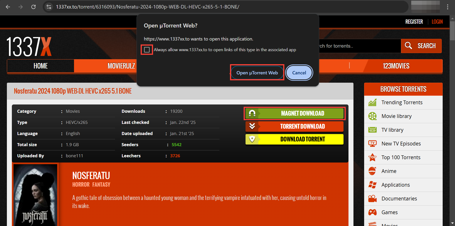 Once you click "Magnet Download" you'll get a prompt to either authorize magnet link sharing or add a client (it varies, but the process is similar). Once you've followed the prompt, click "Magnet Download" to send the link to your uTorrent.