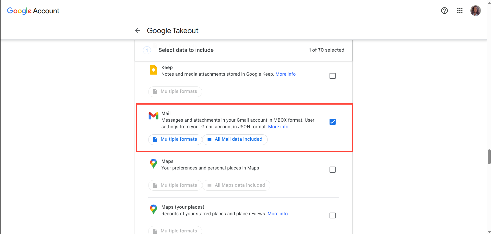 Step 2: By default, all Google services are selected. Click Deselect all and then check only Mail. Then, underneath, click Next Step.
